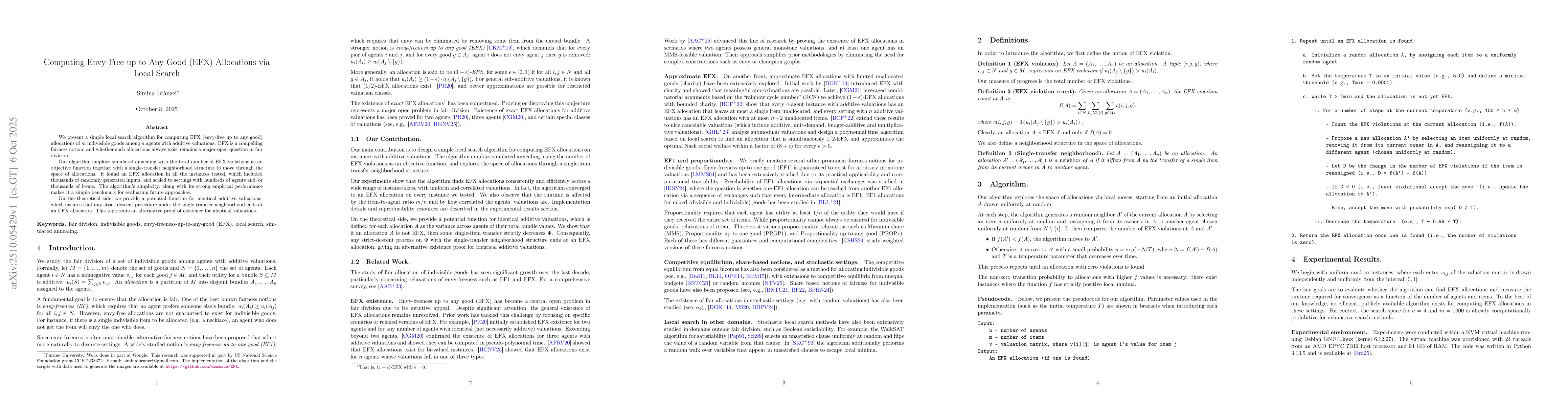 The paper presents a local search algorithm using simulated annealing with a total number of EFX violations as the objective function and a single-transfer neighborhood structure to find EFX allocations. It also introduces a potential function for identical additive valuations to ensure convergence to EFX allocations.