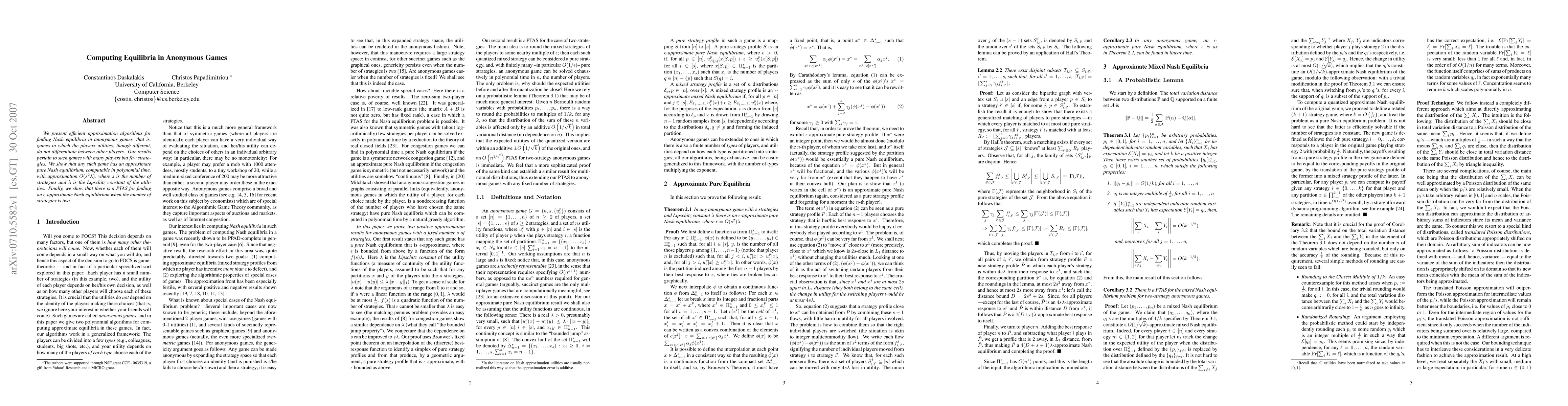 Summary: This paper introduces efficient algorithms for approximating Nash equilibria in anonymous games with many players and few strategies, demonstrating polynomial-time computability and an approximation ratio of O(s^2 L). It also presents a Polynomial Time Approximation Scheme (PTAS) for finding such equilibria.