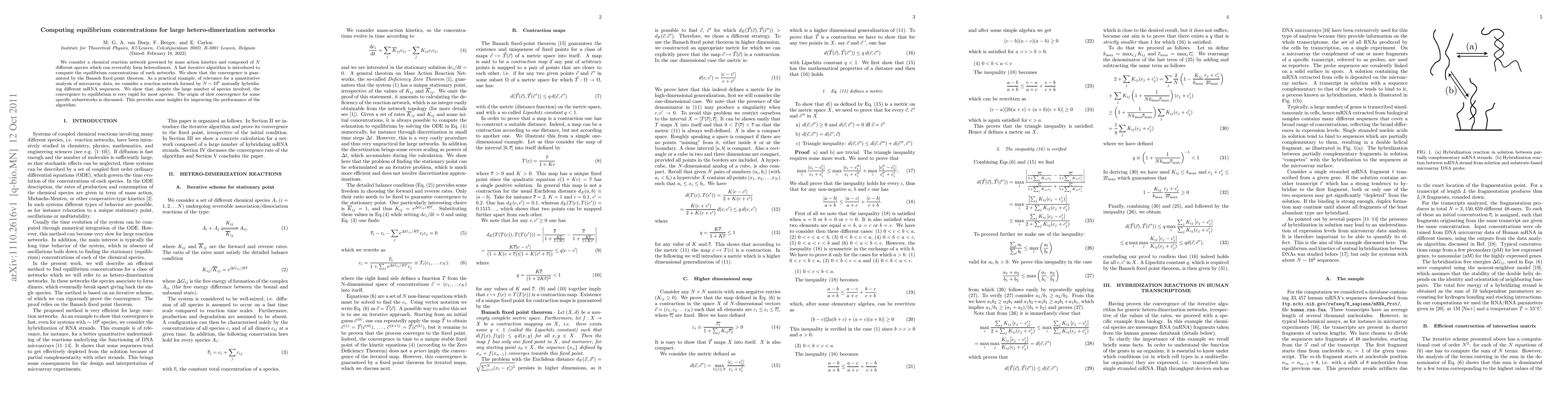 We consider a chemical reaction network governed by mass action kinetics and composed of N different species which can reversibly form heterodimers. A fast iterative algorithm is introduced to compute the equilibrium concentrations of such networks. We show that the convergence is guaranteed by the Banach fixed point theorem. As a practical example, of relevance for a quantitative analysis of microarray data, we consider a reaction network formed by N~10^6 mutually hybridizing different mRNA sequences. We show that, despite the large number of species involved, the convergence to equilibrium is very rapid for most species. The origin of slow convergence for some specific subnetworks is discussed. This provides some insights for improving the performance of the algorithm.