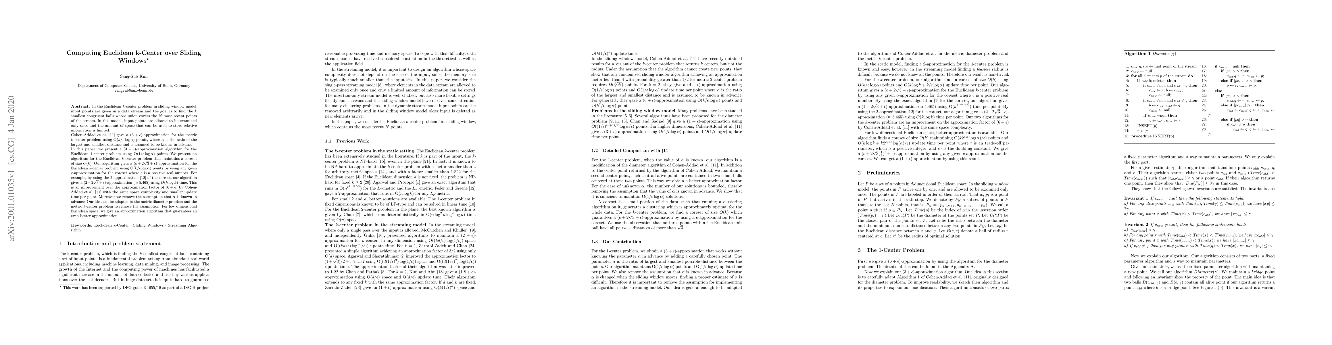 This paper presents an efficient algorithm for the Euclidean k-center problem in a sliding window model, achieving a (3+ε)-approximation with O(1/ε π η) points, improving over previous works by removing assumptions and reducing space complexity.
