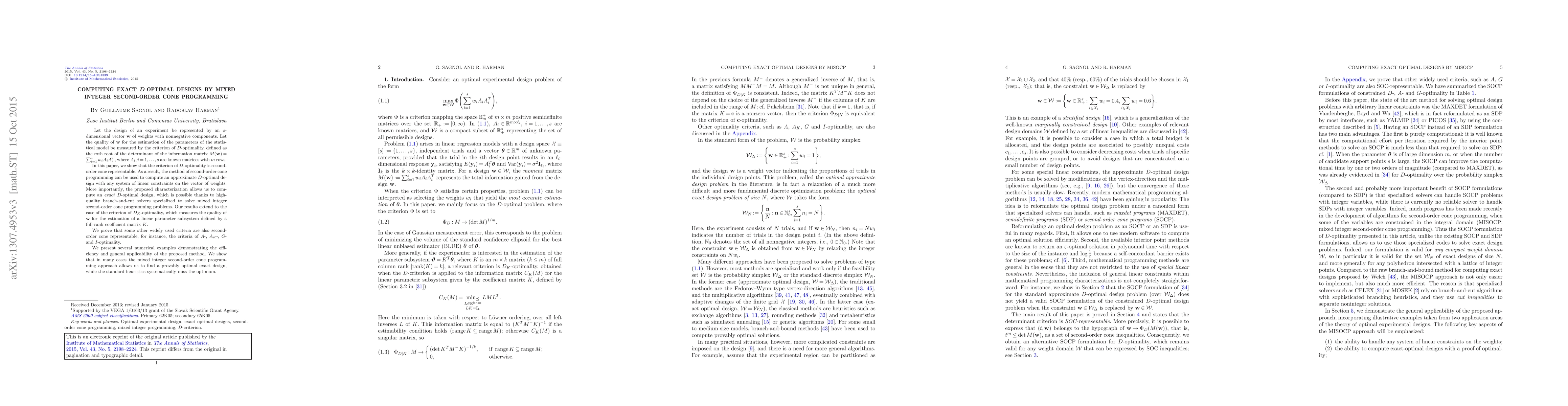 This paper proposes a method using mixed integer second-order cone programming to compute exact $D$-optimal designs for experimental setups, demonstrating its applicability to various optimality criteria. The approach leverages high-quality solvers to find optimal designs that standard heuristics often miss.
