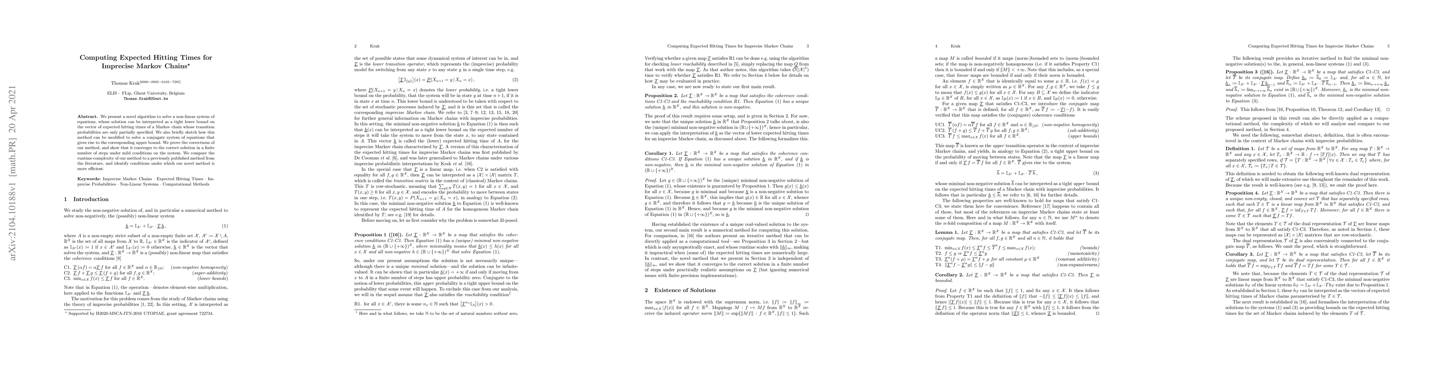 We present a novel algorithm to solve a non-linear system of equations, whose solution can be interpreted as a tight lower bound on the vector of expected hitting times of a Markov chain whose transition probabilities are only partially specified. We also briefly sketch how this method can be modified to solve a conjugate system of equations that gives rise to the corresponding upper bound. We prove the correctness of our method, and show that it converges to the correct solution in a finite number of steps under mild conditions on the system. We compare the runtime complexity of our method to a previously published method from the literature, and identify conditions under which our novel method is more efficient.