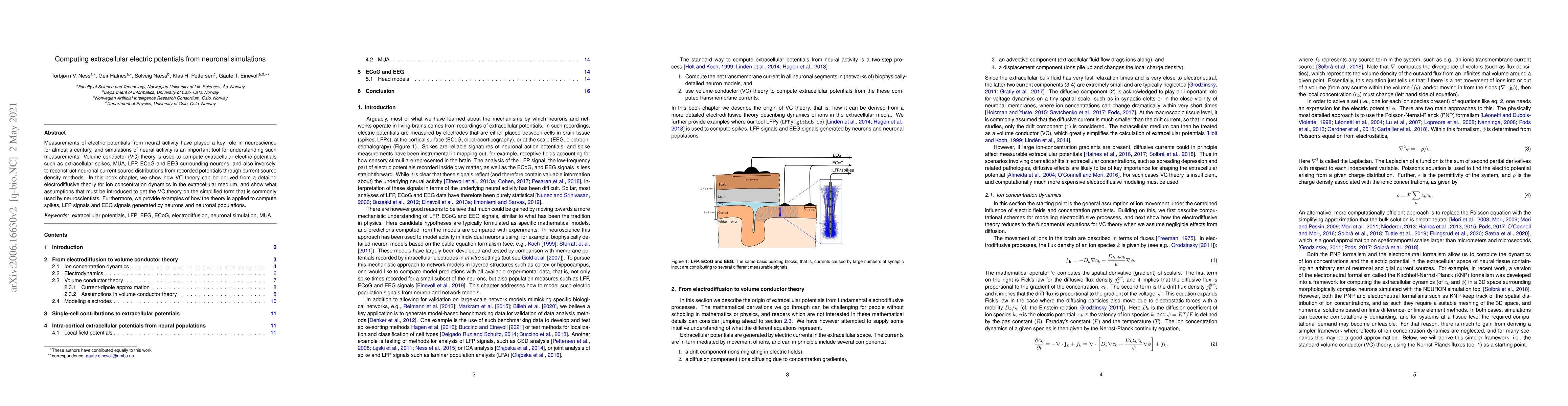 Measurements of electric potentials from neural activity have played a key role in neuroscience for almost a century, and simulations of neural activity is an important tool for understanding such measurements. Volume conductor (VC) theory is used to compute extracellular electric potentials such as extracellular spikes, MUA, LFP, ECoG and EEG surrounding neurons, and also inversely, to reconstruct neuronal current source distributions from recorded potentials through current source density methods. In this book chapter, we show how VC theory can be derived from a detailed electrodiffusive theory for ion concentration dynamics in the extracellular medium, and show what assumptions that must be introduced to get the VC theory on the simplified form that is commonly used by neuroscientists. Furthermore, we provide examples of how the theory is applied to compute spikes, LFP signals and EEG signals generated by neurons and neuronal populations.