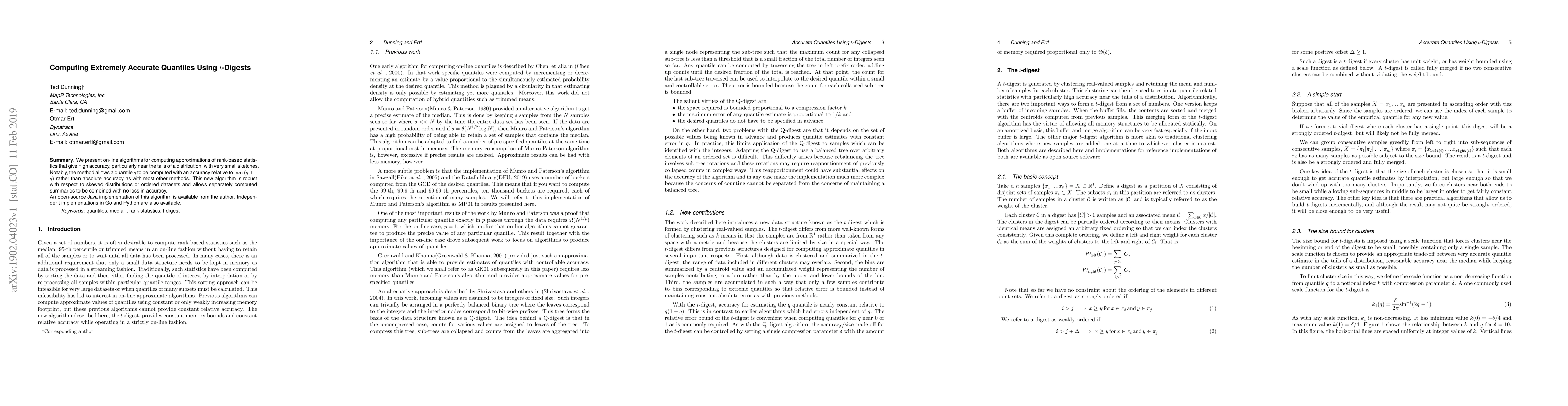 We present on-line algorithms for computing approximations of rank-based statistics that give high accuracy, particularly near the tails of a distribution, with very small sketches. Notably, the method allows a quantile $q$ to be computed with an accuracy relative to $\max(q, 1-q)$ rather than absolute accuracy as with most other methods. This new algorithm is robust with respect to skewed distributions or ordered datasets and allows separately computed summaries to be combined with no loss in accuracy. An open-source Java implementation of this algorithm is available from the author. Independent implementations in Go and Python are also available.