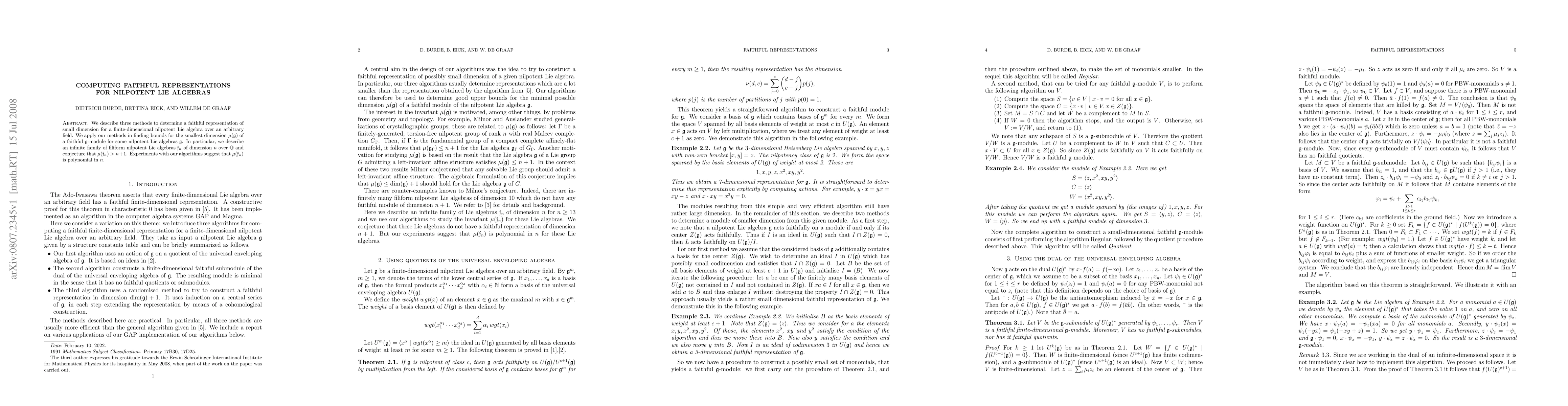 The paper presents three methods to find small-dimensional faithful representations for finite-dimensional nilpotent Lie algebras and applies them to derive bounds for the smallest dimension of a faithful module. It conjectures that for an infinite family of filiform nilpotent Lie algebras, the smallest dimension of a faithful module is greater than $n+1$, with experimental evidence suggesting a polynomial relationship in $n$.