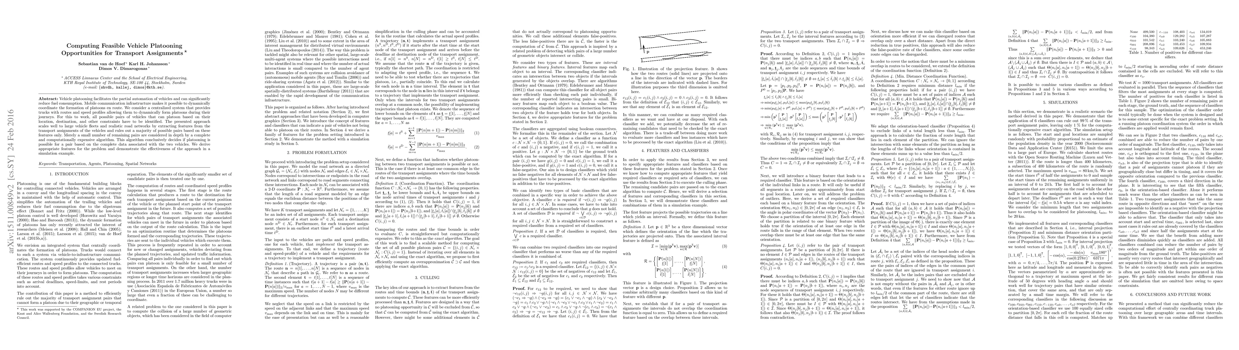 Vehicle platooning facilitates the partial automation of vehicles and can significantly reduce fuel consumption. Mobile communication infrastructure makes it possible to dynamically coordinate the formation of platoons en route. We consider a centralized system that provides trucks with routes and speed profiles allowing them to dynamically form platoons during their journeys. For this to work, all possible pairs of vehicles that can platoon based on their location, destination, and other constraints have to be identified. The presented approach scales well to large vehicle fleets and realistic road networks by extracting features from the transport assignments of the vehicles and rules out a majority of possible pairs based on these features only. Merely a small number of remaining pairs are considered in depth by a complete and computationally expensive algorithm. This algorithm conclusively decides if platooning is possible for a pair based on the complete data associated with the two vehicles. We derive appropriate features for the problem and demonstrate the effectiveness of the approach in a simulation example.