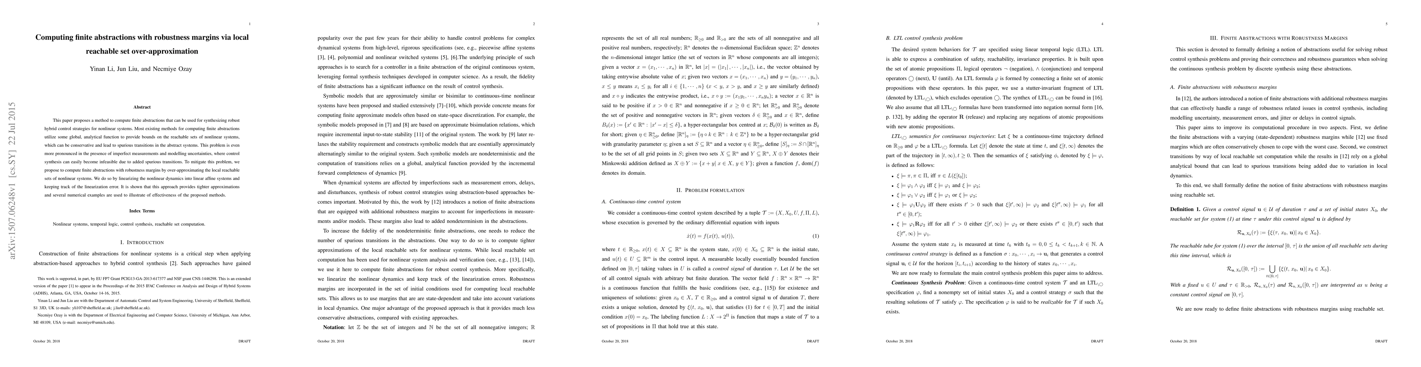 This paper proposes a method to compute finite abstractions that can be used for synthesizing robust hybrid control strategies for nonlinear systems. Most existing methods for computing finite abstractions utilize some global, analytical function to provide bounds on the reachable sets of nonlinear systems, which can be conservative and lead to spurious transitions in the abstract systems. This problem is even more pronounced in the presence of imperfect measurements and modelling uncertainties, where control synthesis can easily become infeasible due to added spurious transitions. To mitigate this problem, we propose to compute finite abstractions with robustness margins by over-approximating the local reachable sets of nonlinear systems. We do so by linearizing the nonlinear dynamics into linear affine systems and keeping track of the linearization error. It is shown that this approach provides tighter approximations and several numerical examples are used to illustrate of effectiveness of the proposed methods.