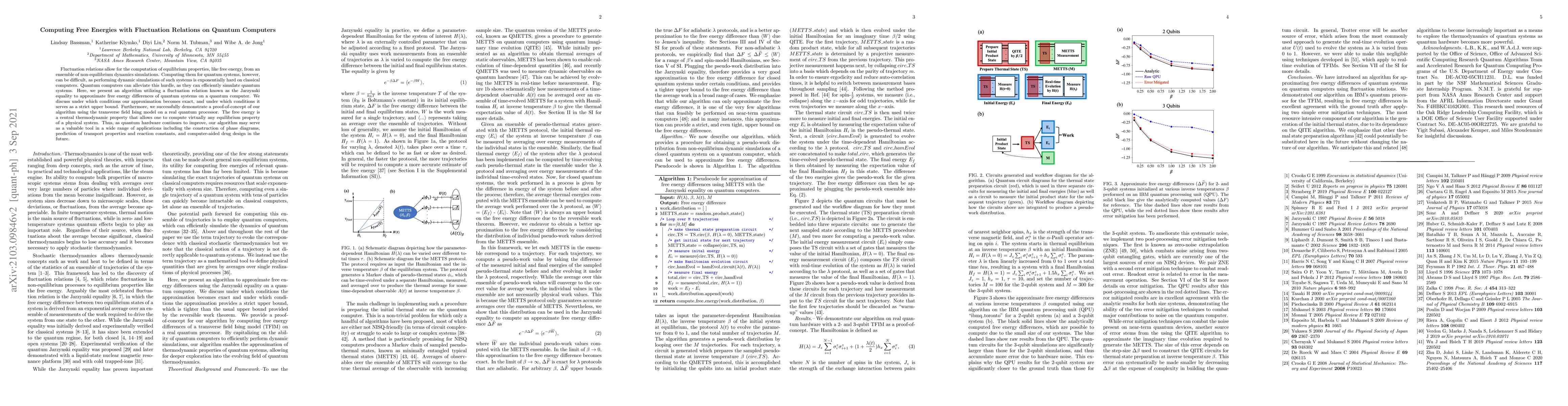 This paper proposes a quantum algorithm to compute free energy differences using the Jarzynski equality on quantum computers, addressing the challenge of simulating quantum systems on classical hardware. The authors demonstrate its effectiveness with the Ising model, highlighting its potential for applications in phase diagrams, transport properties, and drug design.