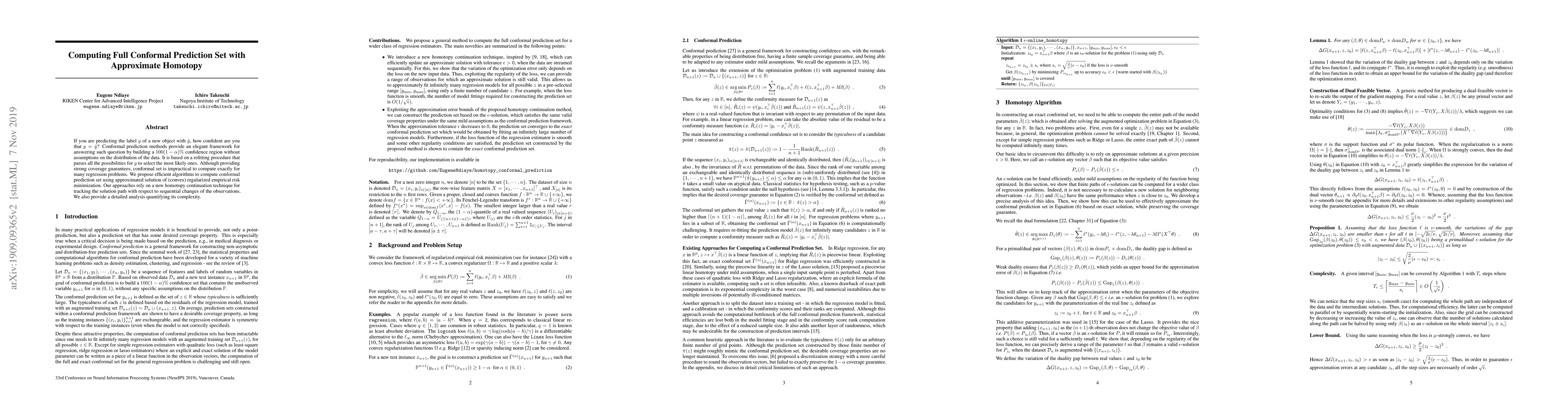 If you are predicting the label $y$ of a new object with $\hat y$, how confident are you that $y = \hat y$? Conformal prediction methods provide an elegant framework for answering such question by building a $100 (1 - \alpha)\%$ confidence region without assumptions on the distribution of the data. It is based on a refitting procedure that parses all the possibilities for $y$ to select the most likely ones. Although providing strong coverage guarantees, conformal set is impractical to compute exactly for many regression problems. We propose efficient algorithms to compute conformal prediction set using approximated solution of (convex) regularized empirical risk minimization. Our approaches rely on a new homotopy continuation technique for tracking the solution path with respect to sequential changes of the observations. We also provide a detailed analysis quantifying its complexity.