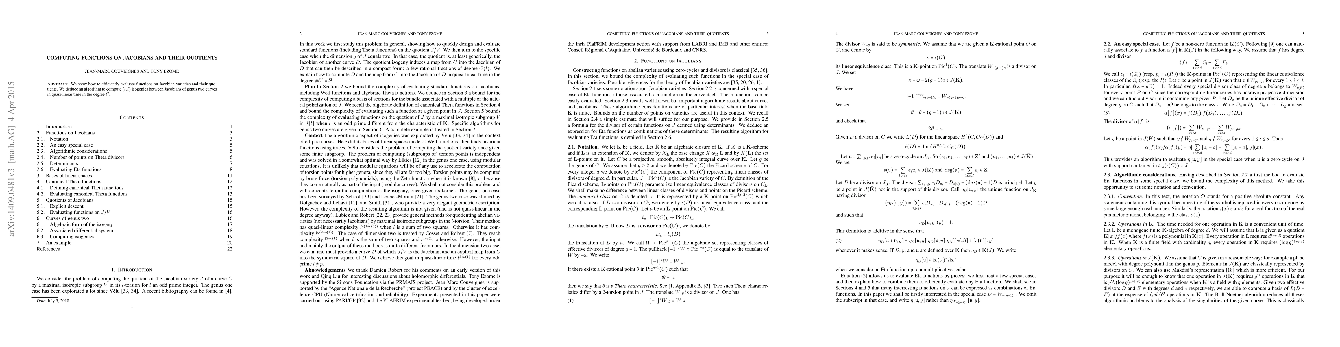 Summary: This paper presents an efficient method for computing functions on Jacobian varieties and their quotients, specifically developing a quasi-optimal algorithm for $(l,l)$ isogenies between Jacobians of genus two curves.