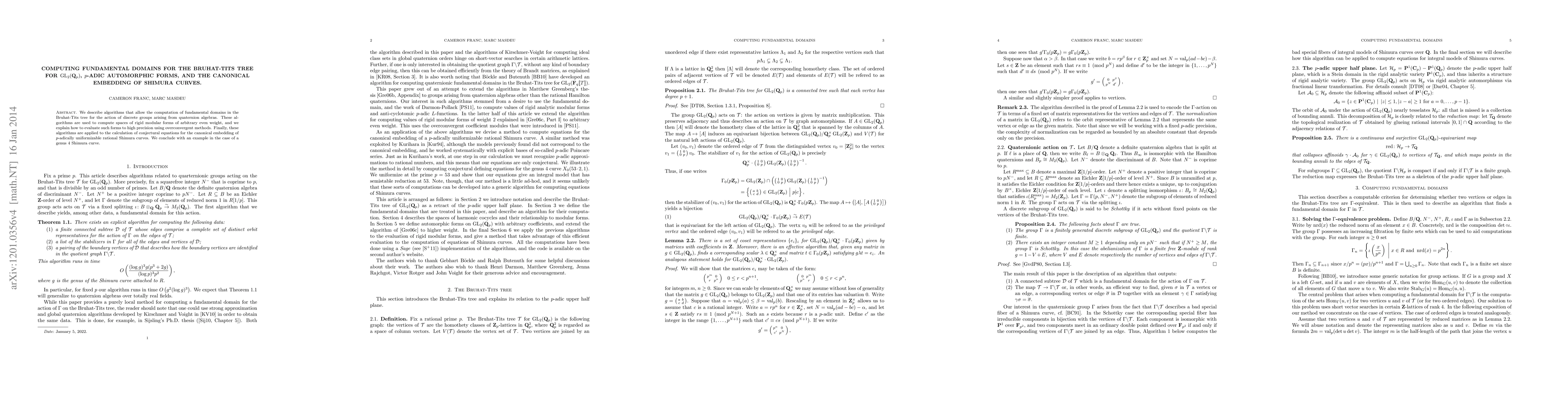 This paper presents an algorithm for computing quaternionic quotients of the Bruhat-Tits tree for GL2(Qp), with applications in deriving conjectural equations for the canonical embedding of Shimura curves using p-adic automorphic forms.