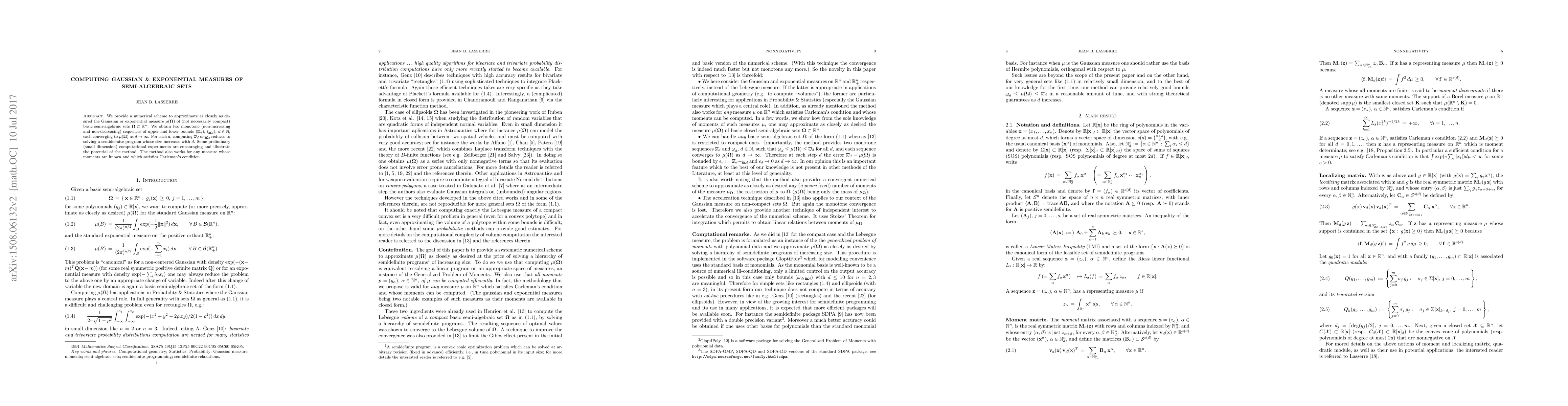 We provide a numerical scheme to approximate as closely as desired the Gaussian or exponential measure $\mu(\om)$ of (not necessarily compact) basic semi-algebraic sets$\om\subset\R^n$. We obtain two monotone (non increasing and non decreasing) sequences of upper and lower bounds $(\overline{\omega}\_d)$, $(\underline{\omega}\_d)$, $d\in\N$, each converging to $\mu(\om)$ as $d\to\infty$. For each $d$, computing $\overline{\omega}\_d$ or $\underline{\omega}\_d$reduces to solving a semidefinite program whose size increases with $d$. Some preliminary (small dimension) computational experiments are encouraging and illustrate thepotential of the method. The method also works for any measure whose moments are known and which satisfies Carleman's condition.