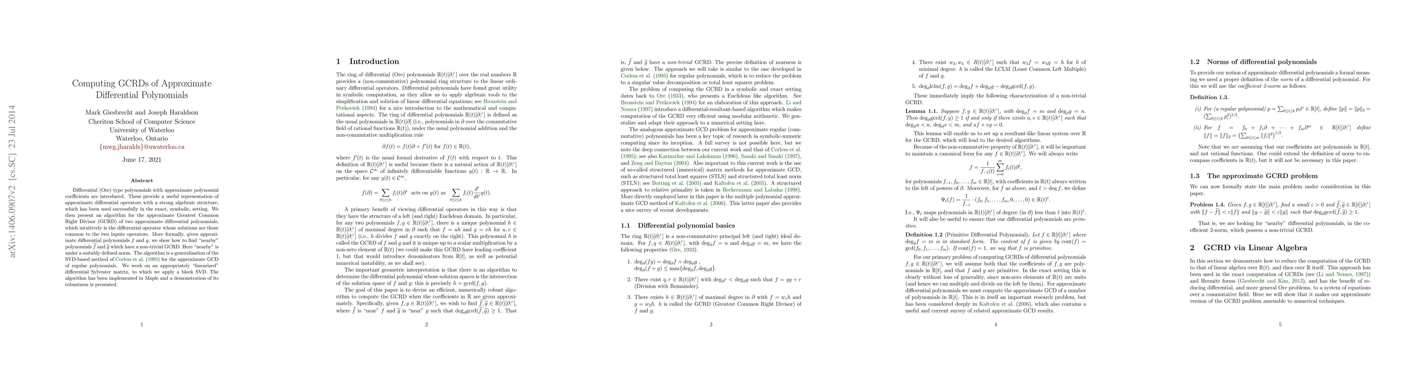 Differential (Ore) type polynomials with approximate polynomial coefficients are introduced. These provide a useful representation of approximate differential operators with a strong algebraic structure, which has been used successfully in the exact, symbolic, setting. We then present an algorithm for the approximate Greatest Common Right Divisor (GCRD) of two approximate differential polynomials, which intuitively is the differential operator whose solutions are those common to the two inputs operators. More formally, given approximate differential polynomials $f$ and $g$, we show how to find "nearby" polynomials $\widetilde f$ and $\widetilde g$ which have a non-trivial GCRD. Here "nearby" is under a suitably defined norm. The algorithm is a generalization of the SVD-based method of Corless et al. (1995) for the approximate GCD of regular polynomials. We work on an appropriately "linearized" differential Sylvester matrix, to which we apply a block SVD. The algorithm has been implemented in Maple and a demonstration of its robustness is presented.