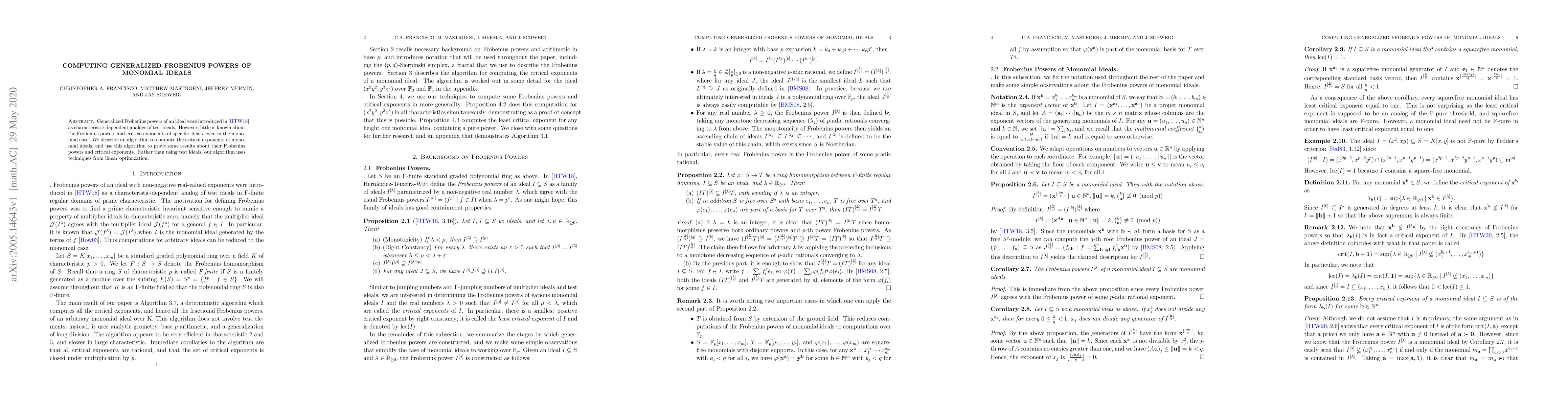 This paper presents an algorithm for computing the critical exponents of monomial ideals, employing linear optimization techniques instead of test ideals, and uses this method to derive results on their Frobenius powers and critical exponents.