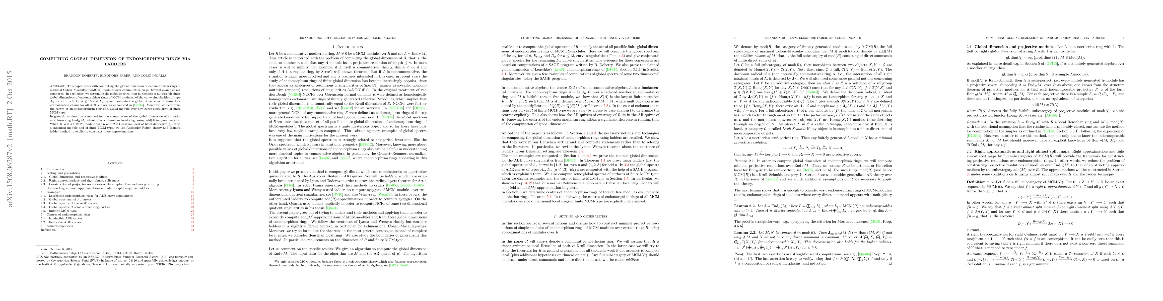 This paper computes the global dimension of endomorphism rings of maximal Cohen-Macaulay modules over certain commutative rings, applying ladder methods and Auslander-Reiten theory to Henselian local rings. It specifically determines the global dimensions for various curve singularities and constructs add(M)-approximations for MCM modules.