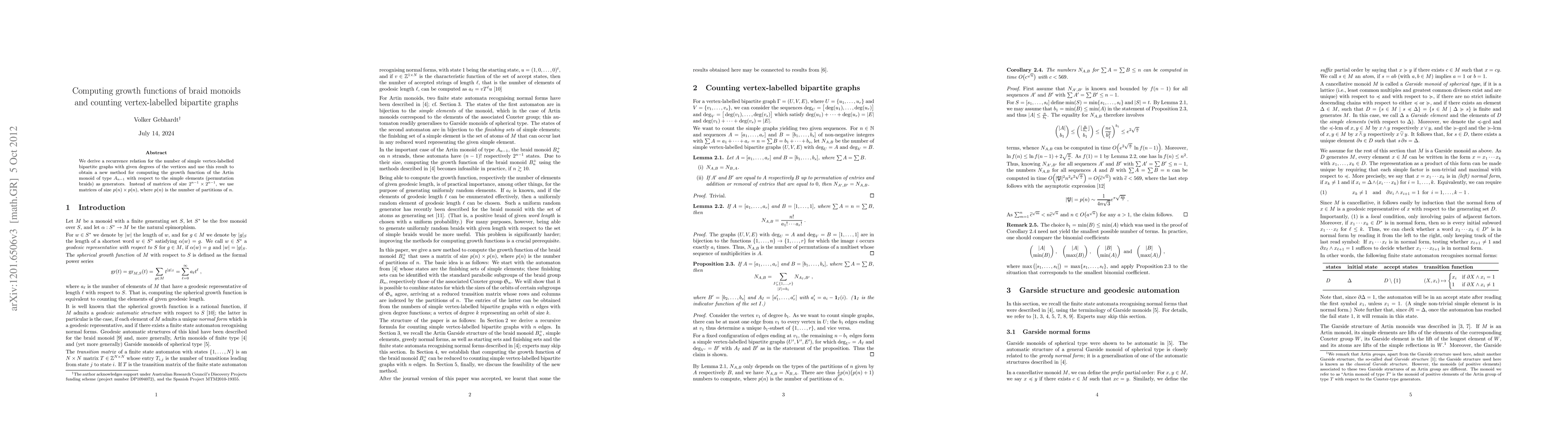 We derive a recurrence relation for the number of simple vertex-labelled bipartite graphs with given degrees of the vertices and use this result to obtain a new method for computing the growth function of the Artin monoid of type $A_{n-1}$ with respect to the simple elements (permutation braids) as generators. Instead of matrices of size $2^{n-1}\times 2^{n-1}$, we use matrices of size $p(n)\times p(n)$, where $p(n)$ is the number of partitions of $n$.