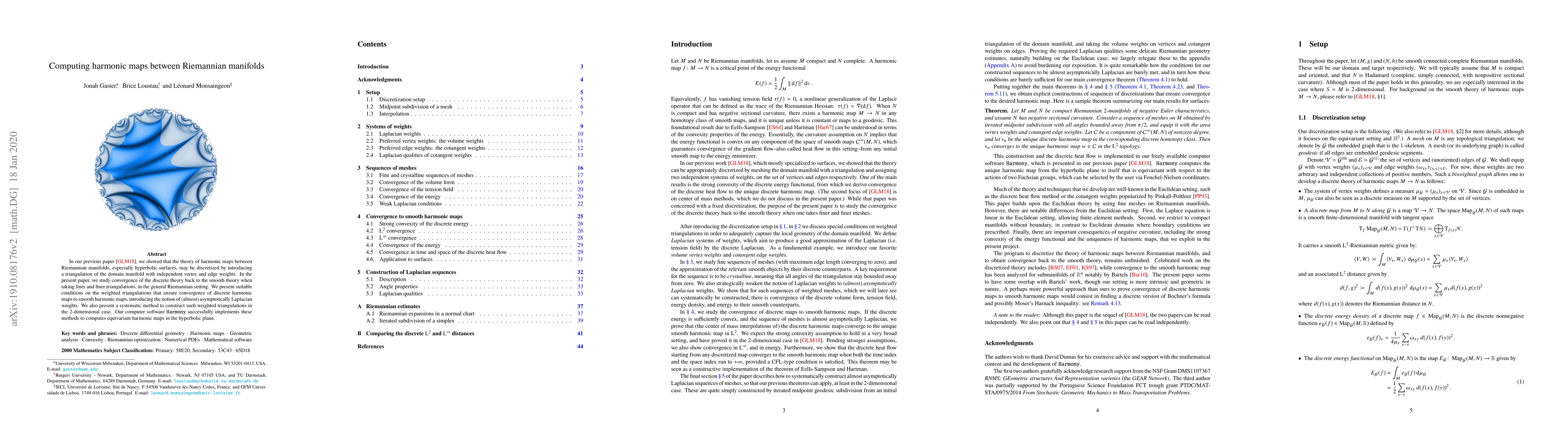 This paper discusses the convergence of discretized harmonic maps between Riemannian manifolds to their smooth counterparts as triangulations become finer. It establishes conditions for weighted triangulations ensuring this convergence and introduces the software Harmony for computing equivariant harmonic maps in hyperbolic space.