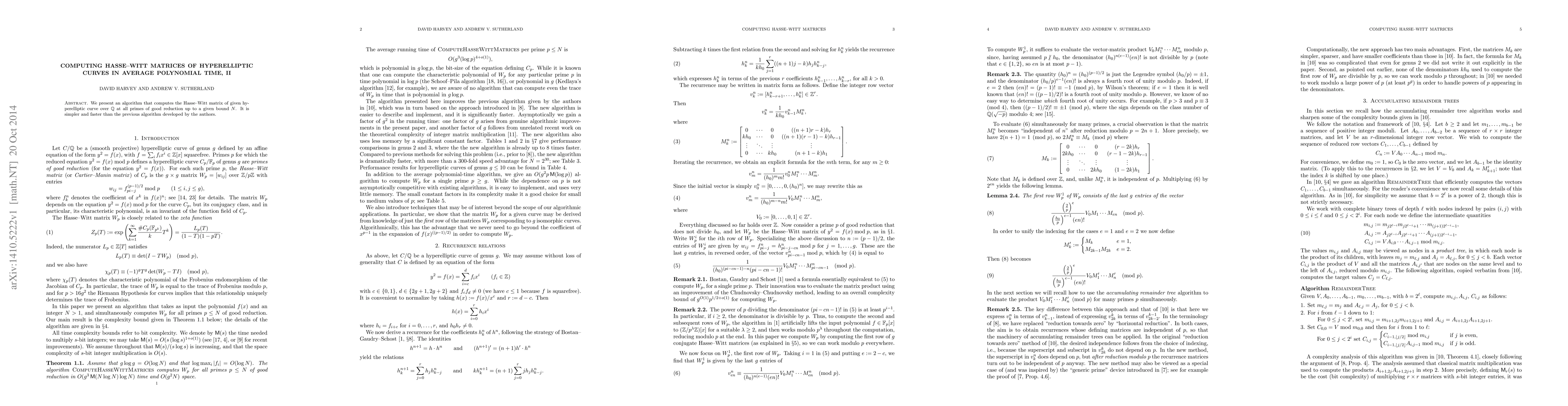 Summary: This paper introduces an efficient algorithm for computing the Hasse-Witt matrices of hyperelliptic curves over Q at primes of good reduction, achieving average polynomial time complexity and surpassing previous methods in simplicity and speed.
