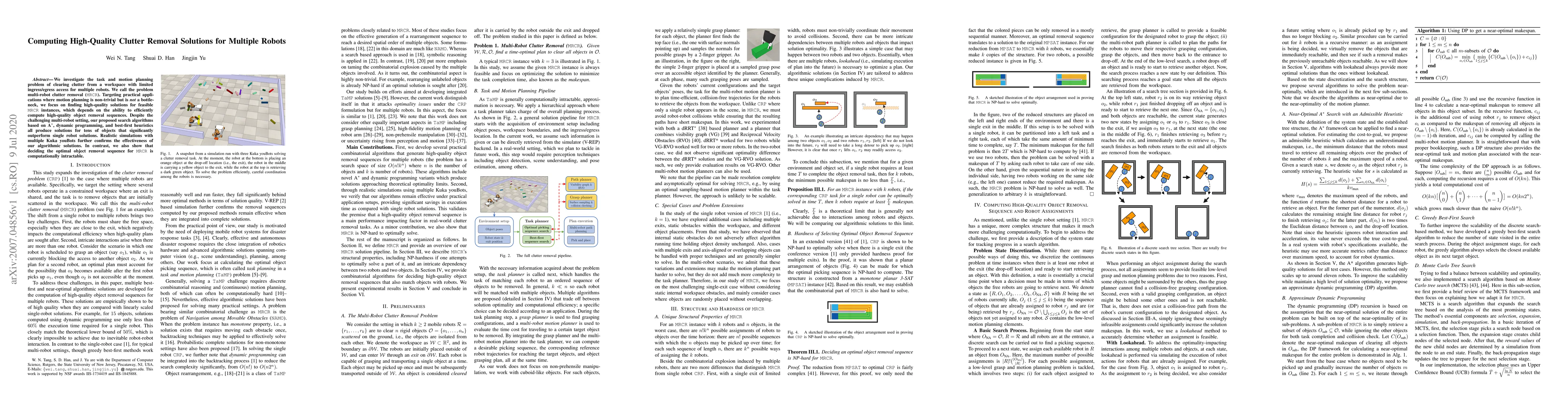 We investigate the task and motion planning problem of clearing clutter from a workspace with limited ingress/egress access for multiple robots. We call the problem multi-robot clutter removal (MRCR). Targeting practical applications where motion planning is non-trivial but is not a bottleneck, we focus on finding high-quality solutions for feasible MRCR instances, which depends on the ability to efficiently compute high-quality object removal sequences. Despite the challenging multi-robot setting, our proposed search algorithms based on A*, dynamic programming, and best-first heuristics all produce solutions for tens of objects that significantly outperform single robot solutions. Realistic simulations with multiple Kuka youBots further confirms the effectiveness of our algorithmic solutions. In contrast, we also show that deciding the optimal object removal sequence for MRCR is computationally intractable.