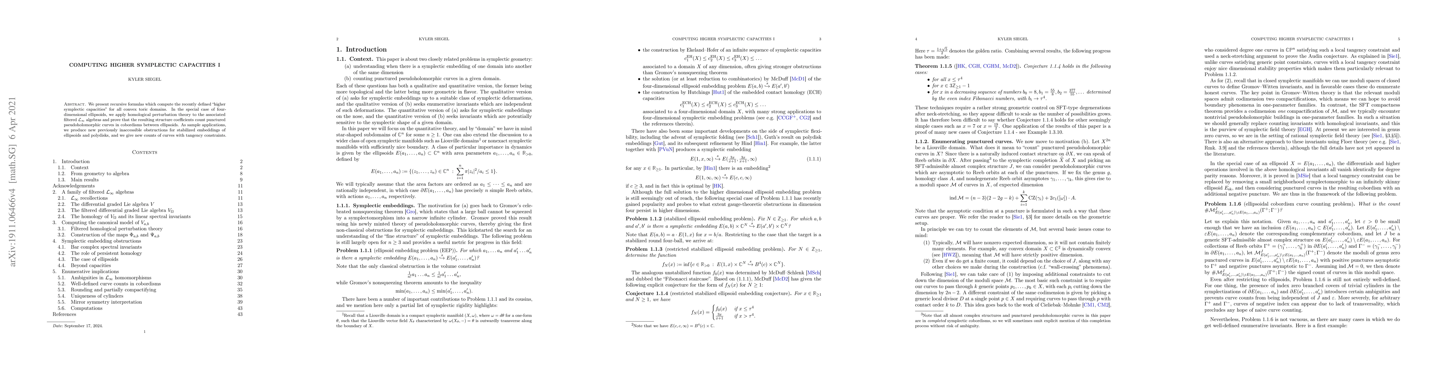 This paper introduces recursive methods to compute higher symplectic capacities for convex toric domains, applying homological perturbation theory to four-dimensional ellipsoids to show that the resulting coefficients count punctured pseudoholomorphic curves. It also provides new obstructions for stabilized embeddings and counts of tangency-constrained curves.