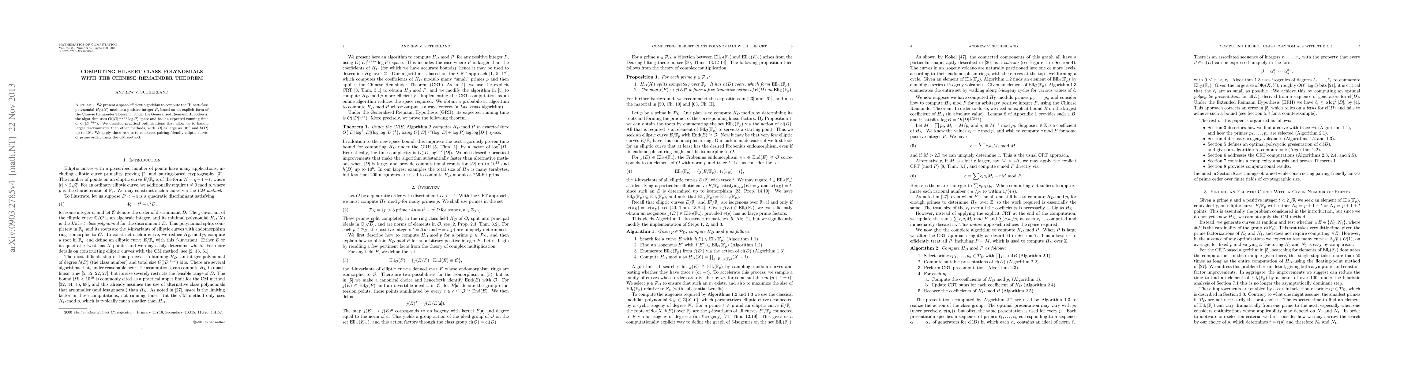 This paper introduces an efficient algorithm to compute Hilbert class polynomials modulo a number P, utilizing the Chinese Remainder Theorem. It achieves this with optimized space complexity O(|D|^(1/2+o(1))log P) and expected time complexity O(|D|^(1+o(1))), handling large discriminants up to 10^13. The method is applied to create pairing-friendly elliptic curves with prime order.
