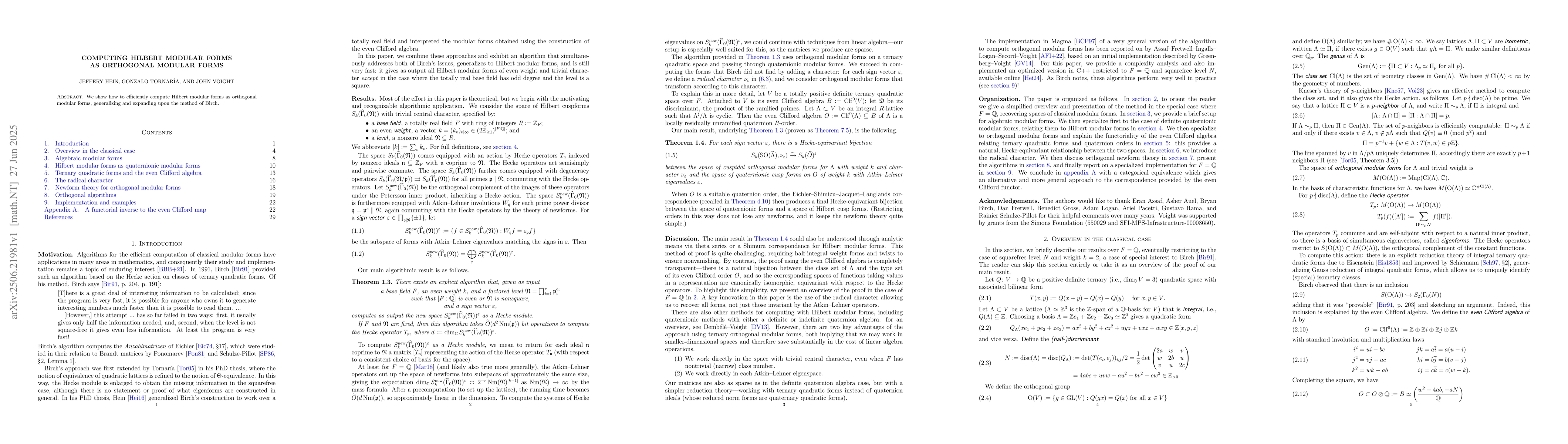 This paper presents a method to efficiently compute Hilbert modular forms by treating them as orthogonal modular forms, building on Birch's approach and providing a generalized technique.
