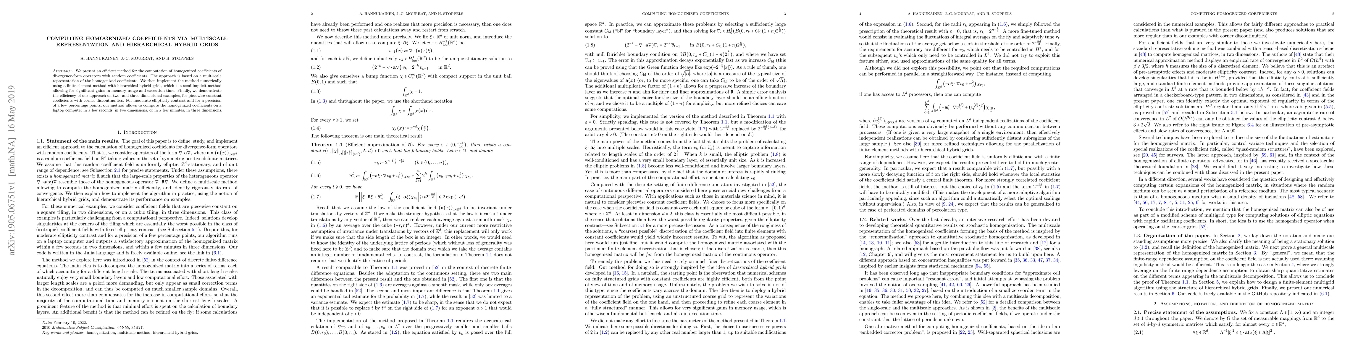 We present an efficient method for the computation of homogenized coefficients of divergence-form operators with random coefficients. The approach is based on a multiscale representation of the homogenized coefficients. We then implement the method numerically using a finite-element method with hierarchical hybrid grids, which is a semi-implicit method allowing for significant gains in memory usage and execution time. Finally, we demonstrate the efficiency of our approach on two- and three-dimensional examples, for piecewise-constant coefficients with corner discontinuities. For moderate ellipticity contrast and for a precision of a few percentage points, our method allows to compute the homogenized coefficients on a laptop computer in a few seconds, in two dimensions, or in a few minutes, in three dimensions.