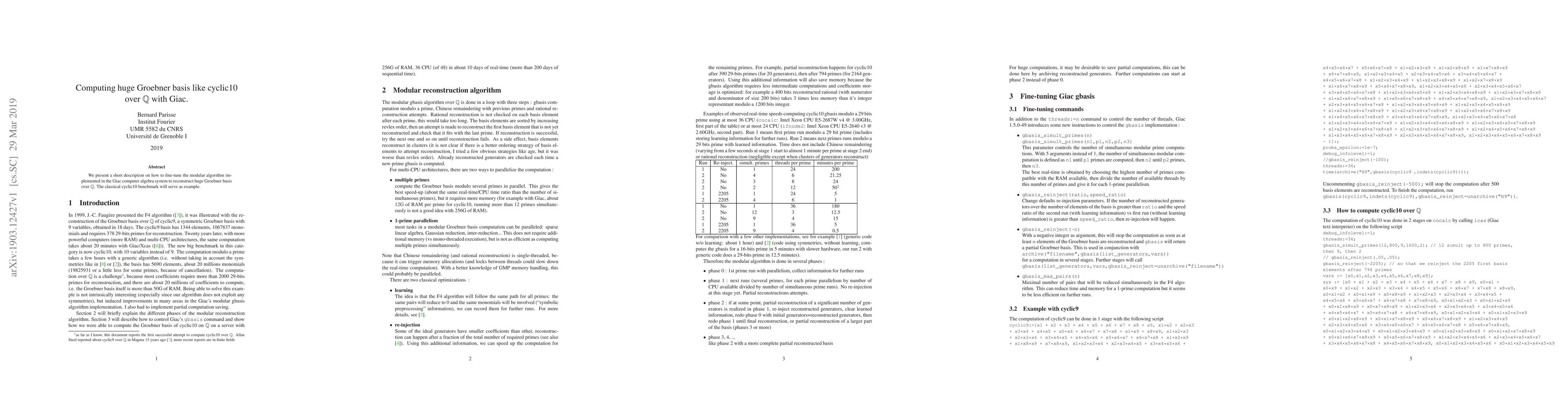 We present a short description on how to fine-tune the modular algorithm implemented in the Giac computer algebra system to reconstruct huge Groebner basis over $\Q$.The classical cyclic10 benchmark will serve as example.