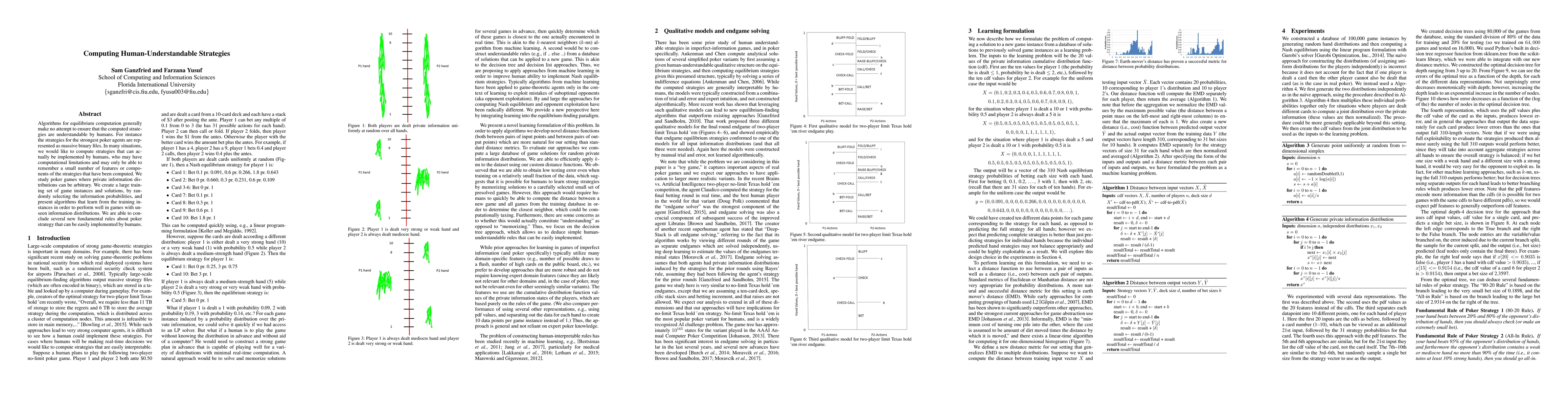 Algorithms for equilibrium computation generally make no attempt to ensure that the computed strategies are understandable by humans. For instance the strategies for the strongest poker agents are represented as massive binary files. In many situations, we would like to compute strategies that can actually be implemented by humans, who may have computational limitations and may only be able to remember a small number of features or components of the strategies that have been computed. We study poker games where private information distributions can be arbitrary. We create a large training set of game instances and solutions, by randomly selecting the information probabilities, and present algorithms that learn from the training instances in order to perform well in games with unseen information distributions. We are able to conclude several new fundamental rules about poker strategy that can be easily implemented by humans.