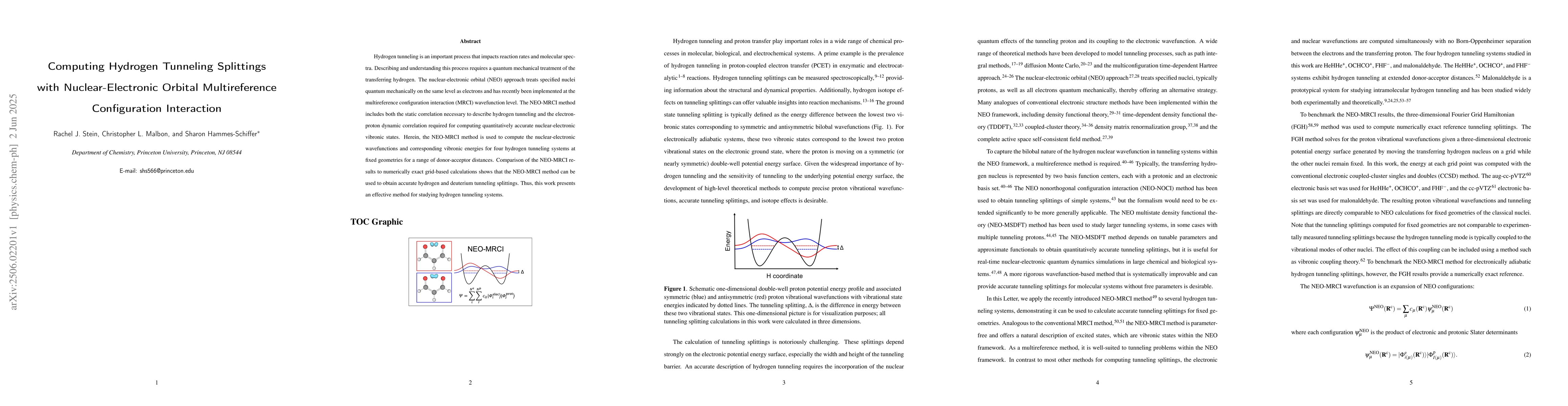 This work is novel as it combines the nuclear-electronic orbital (NEO) approach with multireference configuration interaction (MRCI) to study hydrogen tunneling systems, providing a comprehensive method for computing tunneling splittings.