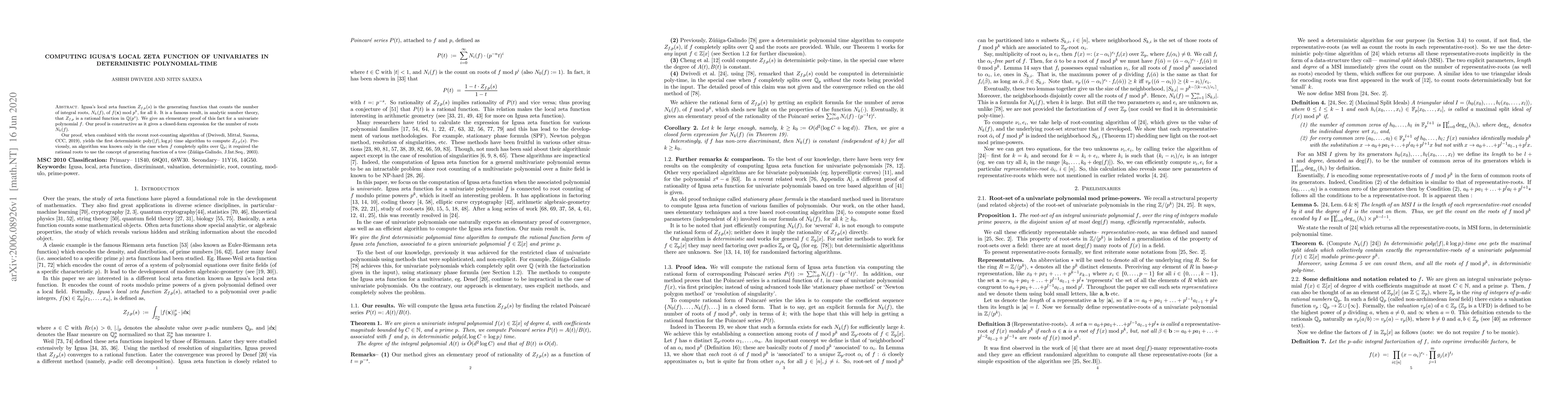 Igusa's local zeta function $Z_{f,p}(s)$ is the generating function that counts the number of integral roots, $N_{k}(f)$, of $f(\mathbf x) \bmod p^k$, for all $k$. It is a famous result, in analytic number theory, that $Z_{f,p}$ is a rational function in $\mathbb{Q}(p^s)$. We give an elementary proof of this fact for a univariate polynomial $f$. Our proof is constructive as it gives a closed-form expression for the number of roots $N_{k}(f)$. Our proof, when combined with the recent root-counting algorithm of (Dwivedi, Mittal, Saxena, CCC, 2019), yields the first deterministic poly($|f|, \log p$) time algorithm to compute $Z_{f,p}(s)$. Previously, an algorithm was known only in the case when $f$ completely splits over $\mathbb{Q}_p$; it required the rational roots to use the concept of generating function of a tree (Z\'u\~niga-Galindo, J.Int.Seq., 2003).