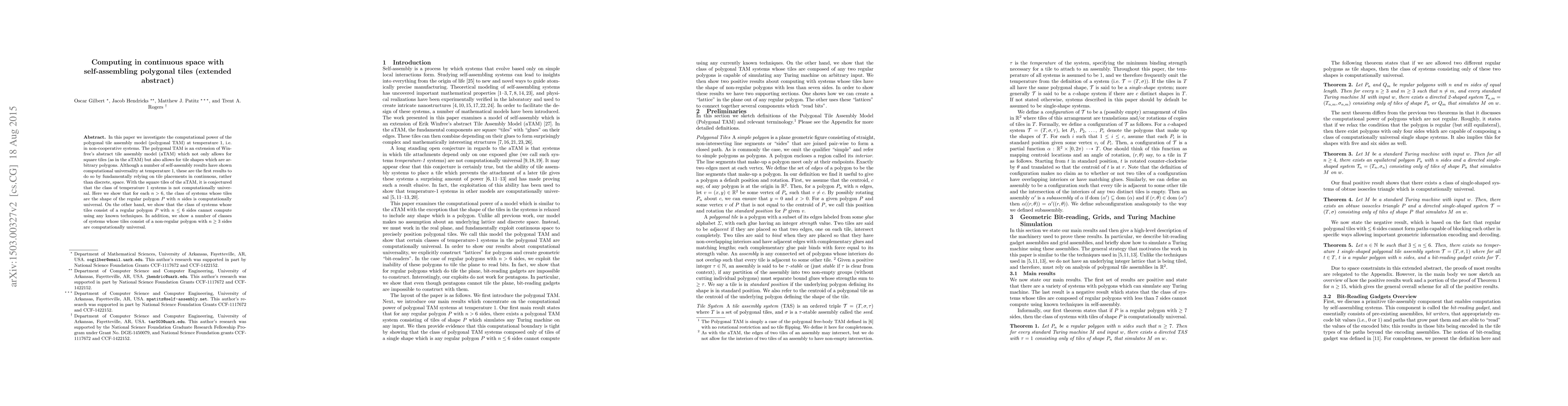 In this paper we investigate the computational power of the polygonal tile assembly model (polygonal TAM) at temperature 1, i.e. in non-cooperative systems. The polygonal TAM is an extension of Winfree's abstract tile assembly model (aTAM) which not only allows for square tiles (as in the aTAM) but also allows for tile shapes that are polygons. Although a number of self-assembly results have shown computational universality at temperature 1, these are the first results to do so by fundamentally relying on tile placements in continuous, rather than discrete, space. With the square tiles of the aTAM, it is conjectured that the class of temperature 1 systems is not computationally universal. Here we show that the class of systems whose tiles are composed of a regular polygon P with n > 6 sides is computationally universal. On the other hand, we show that the class of systems whose tiles consist of a regular polygon P with n <= 6 cannot compute using any known techniques. In addition, we show a number of classes of systems whose tiles consist of a non-regular polygon with n >= 3 sides are computationally universal.