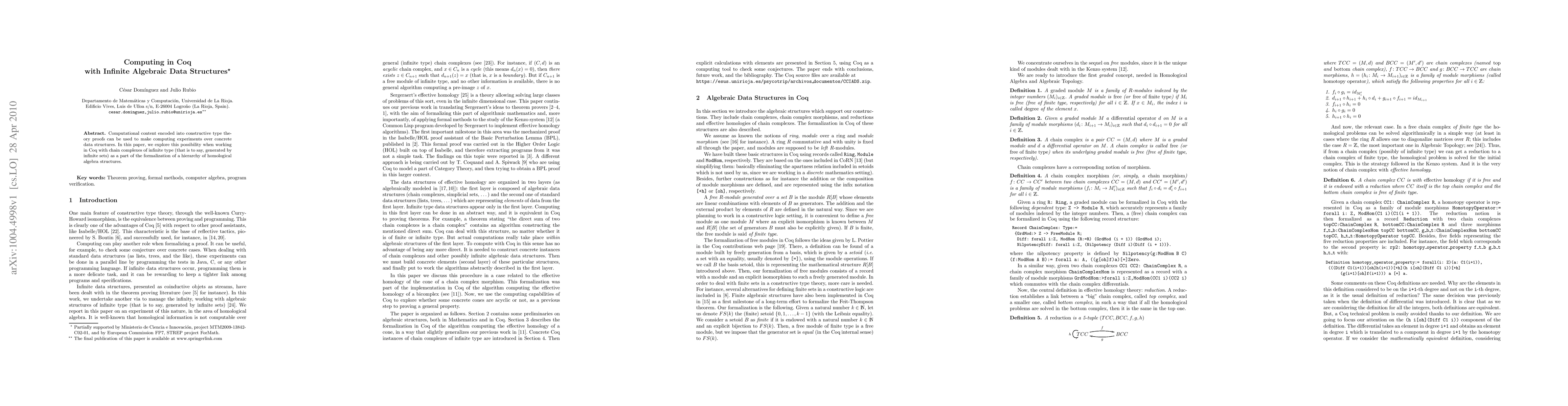 This paper investigates how computational content in Coq's constructive type theory can be utilized to experiment with infinite algebraic data structures, specifically focusing on chain complexes generated by infinite sets as part of formalizing homological algebra.
