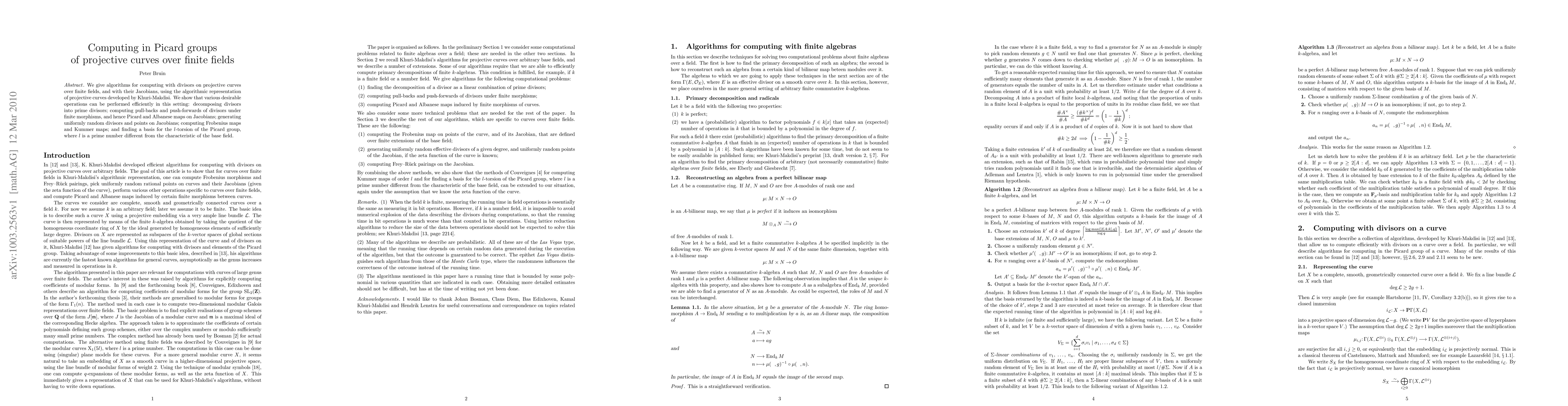 This paper presents efficient algorithms for computing with divisors on projective curves over finite fields and their Jacobians, leveraging Khuri-Makdisi's algorithmic representation. It covers operations such as divisor decomposition, morphisms, random generation, and torsion group computations.