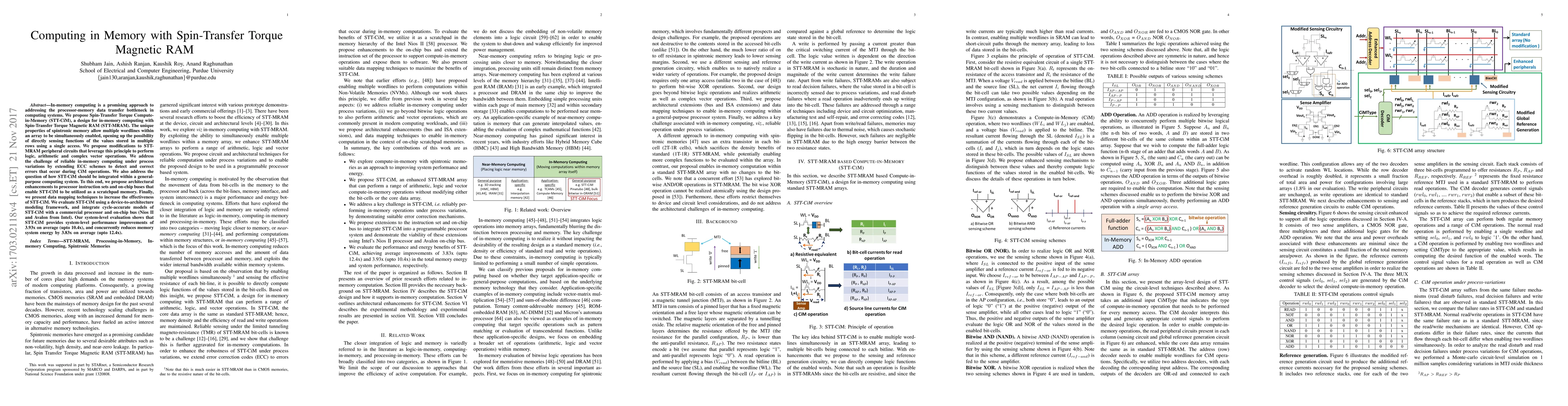 In-memory computing is a promising approach to addressing the processor-memory data transfer bottleneck in computing systems. We propose Spin-Transfer Torque Compute-in-Memory (STT-CiM), a design for in-memory computing with Spin-Transfer Torque Magnetic RAM (STT-MRAM). The unique properties of spintronic memory allow multiple wordlines within an array to be simultaneously enabled, opening up the possibility of directly sensing functions of the values stored in multiple rows using a single access. We propose modifications to STT-MRAM peripheral circuits that leverage this principle to perform logic, arithmetic, and complex vector operations. We address the challenge of reliable in-memory computing under process variations by extending ECC schemes to detect and correct errors that occur during CiM operations. We also address the question of how STT-CiM should be integrated within a general-purpose computing system. To this end, we propose architectural enhancements to processor instruction sets and on-chip buses that enable STT-CiM to be utilized as a scratchpad memory. Finally, we present data mapping techniques to increase the effectiveness of STT-CiM. We evaluate STT-CiM using a device-to-architecture modeling framework, and integrate cycle-accurate models of STT-CiM with a commercial processor and on-chip bus (Nios II and Avalon from Intel). Our system-level evaluation shows that STT-CiM provides system-level performance improvements of 3.93x on average (upto 10.4x), and concurrently reduces memory system energy by 3.83x on average (upto 12.4x).