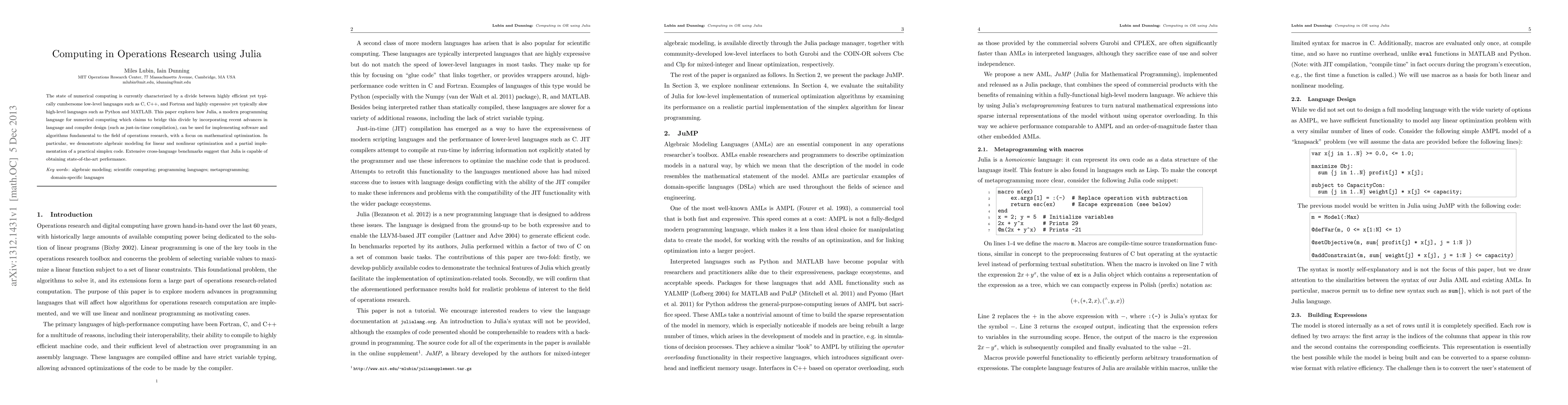 This paper investigates Julia's potential to bridge the efficiency-expressivity gap in numerical computing for operations research, showcasing its use in implementing optimization algorithms and demonstrating competitive performance through cross-language benchmarks.