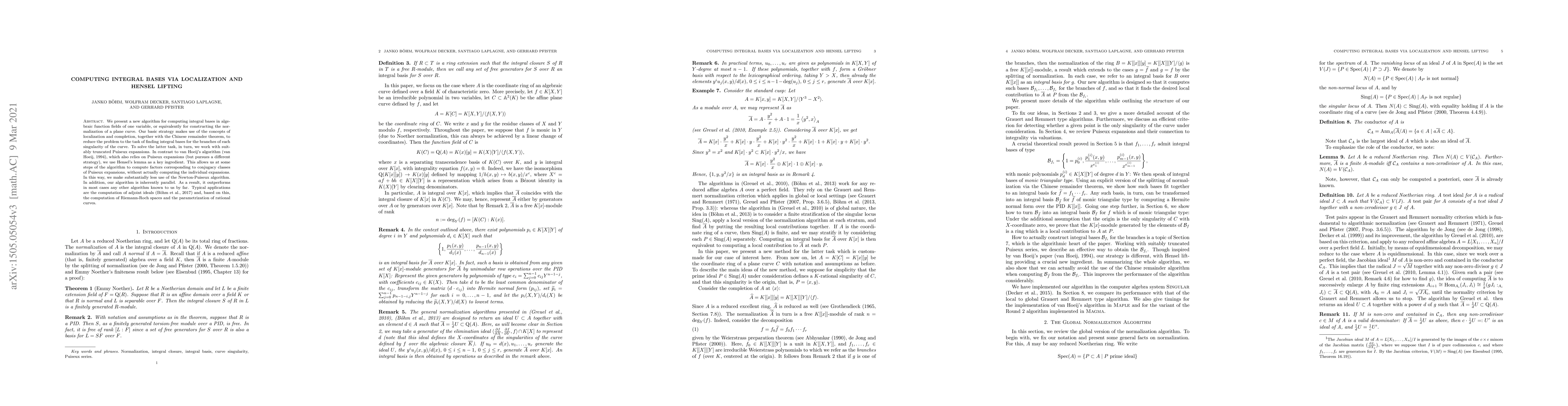 A new algorithm computes integral bases in algebraic function fields more efficiently than existing methods, using localization and Hensel lifting to reduce the problem to finding integral bases for each singularity of a curve.