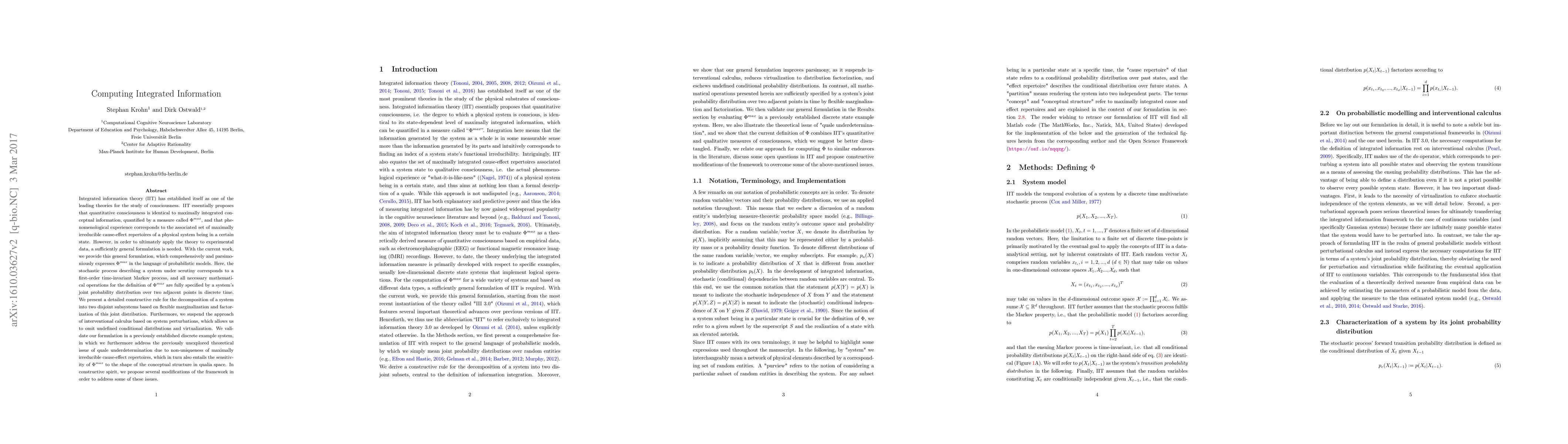 Integrated information theory (IIT) has established itself as one of the leading theories for the study of consciousness. IIT essentially proposes that quantitative consciousness is identical to maximally integrated conceptual information, quantified by a measure called $\Phi^{max}$, and that phenomenological experience corresponds to the associated set of maximally irreducible cause-effect repertoires of a physical system being in a certain state. However, in order to ultimately apply the theory to experimental data, a sufficiently general formulation is needed. With the current work, we provide this general formulation, which comprehensively and parsimoniously expresses $\Phi^{max}$ in the language of probabilistic models. Here, the stochastic process describing a system under scrutiny corresponds to a first-order time-invariant Markov process, and all necessary mathematical operations for the definition of $\Phi^{max}$ are fully specified by a system's joint probability distribution over two adjacent points in discrete time. We present a detailed constructive rule for the decomposition of a system into two disjoint subsystems based on flexible marginalization and factorization of this joint distribution. Furthermore, we suspend the approach of interventional calculus based on system perturbations, which allows us to omit undefined conditional distributions and virtualization. We validate our formulation in a previously established discrete example system, in which we furthermore address the previously unexplored theoretical issue of quale underdetermination due to non-uniqueness of maximally irreducible cause-effect repertoires, which in turn also entails the sensitivity of $\Phi^{max}$ to the shape of the conceptual structure in qualia space. In constructive spirit, we propose several modifications of the framework in order to address some of these issues.