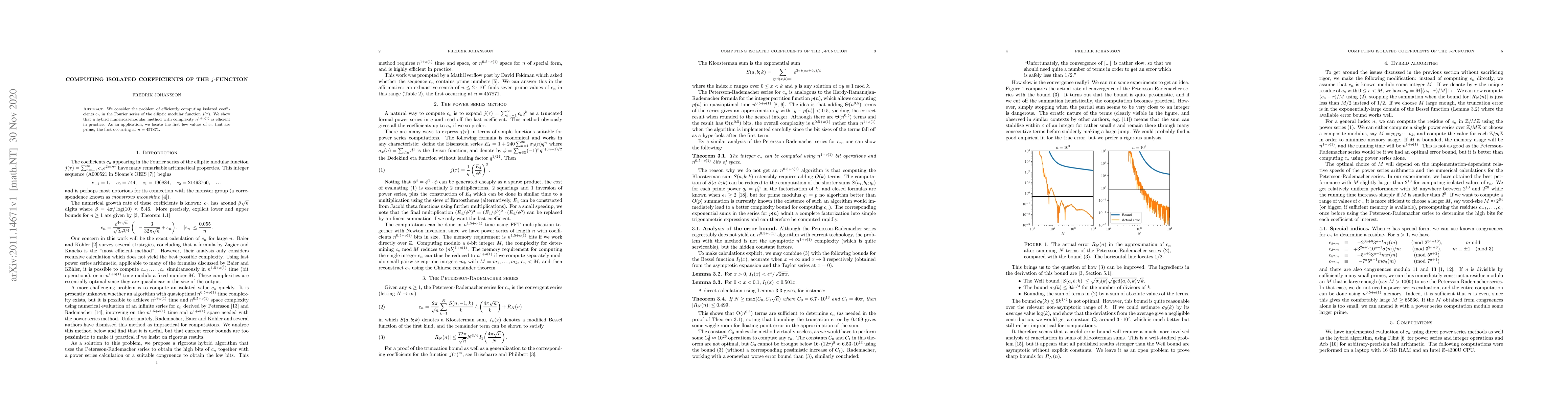 We consider the problem of efficiently computing isolated coefficients $c_n$ in the Fourier series of the elliptic modular function $j(\tau)$. We show that a hybrid numerical-modular method with complexity $n^{1+o(1)}$ is efficient in practice. As an application, we locate the first few values of $c_n$ that are prime, the first occurring at $n = 457871$.