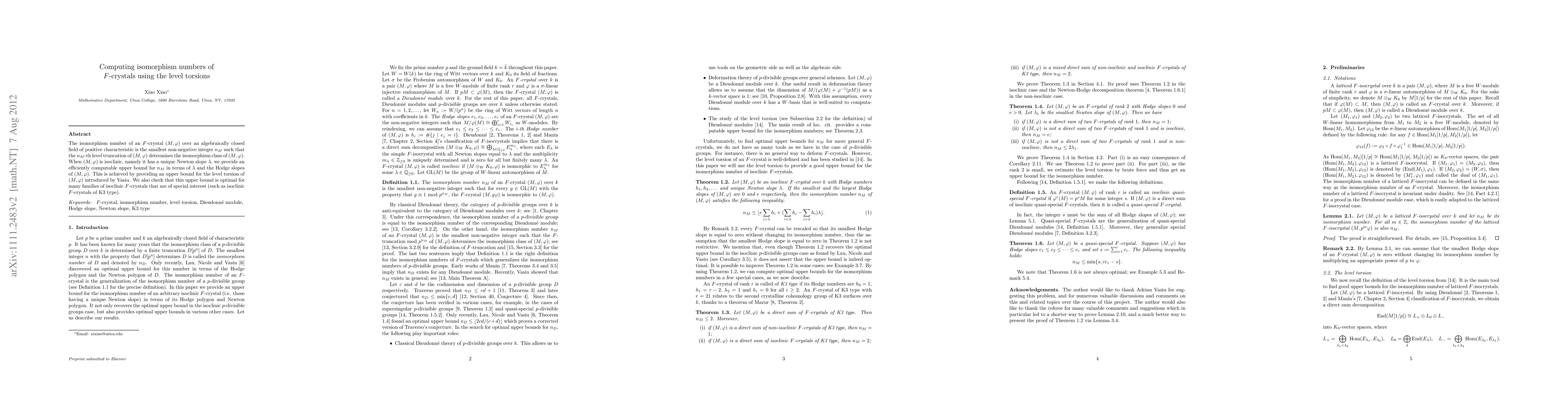 The isomorphism number of an $F$-crystal $(M, \phi)$ over an algebraically closed field of positive characteristic is the smallest non-negative integer $n_M$ such that the $n_M$-th level truncation of $(M, \phi)$ determines the isomorphism class of $(M, \phi)$. When $(M, \phi)$ is isoclinic, namely it has a unique Newton slopes $\lambda$, we provide an efficiently computable upper bound of $n_M$ in terms of the Hodge slopes of $(M, \phi)$ and $\lambda$. This is achieved by providing an upper bound of the level torsion of $(M, \phi)$ introduced by Vasiu. We also check that this upper bound is optimal for many families of isoclinic $F$-crystals that are of special interests (such as isoclinic $F$-crystals of K3 type).