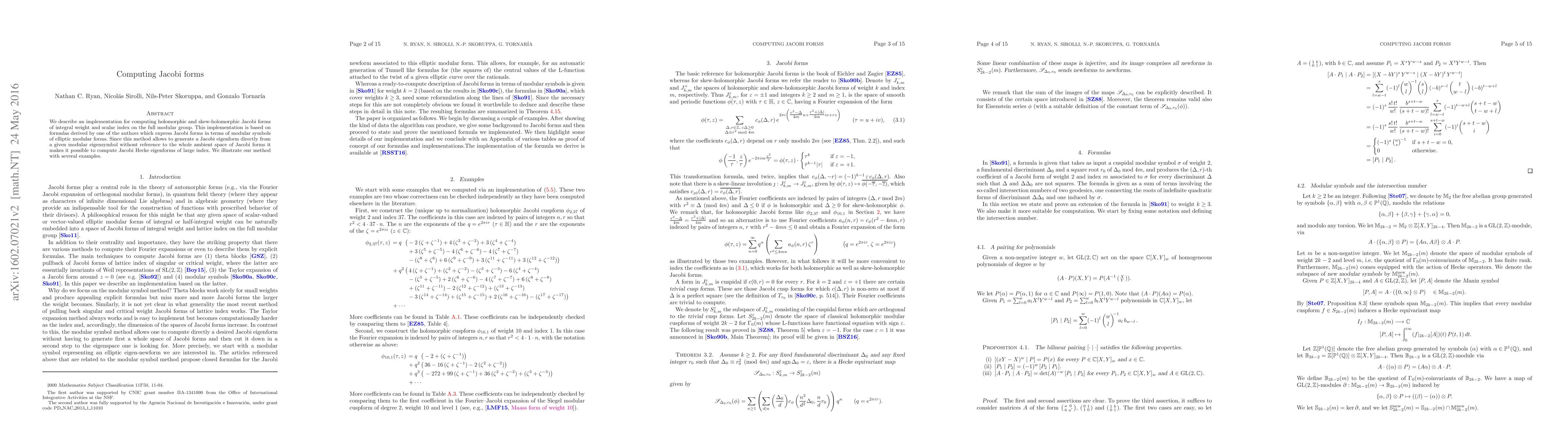 The paper presents an efficient implementation for computing Jacobi forms via modular symbols, allowing direct generation of Jacobi eigenforms from modular eigensymbols, facilitating computation of large index Jacobi Hecke eigenforms, demonstrated through several examples.