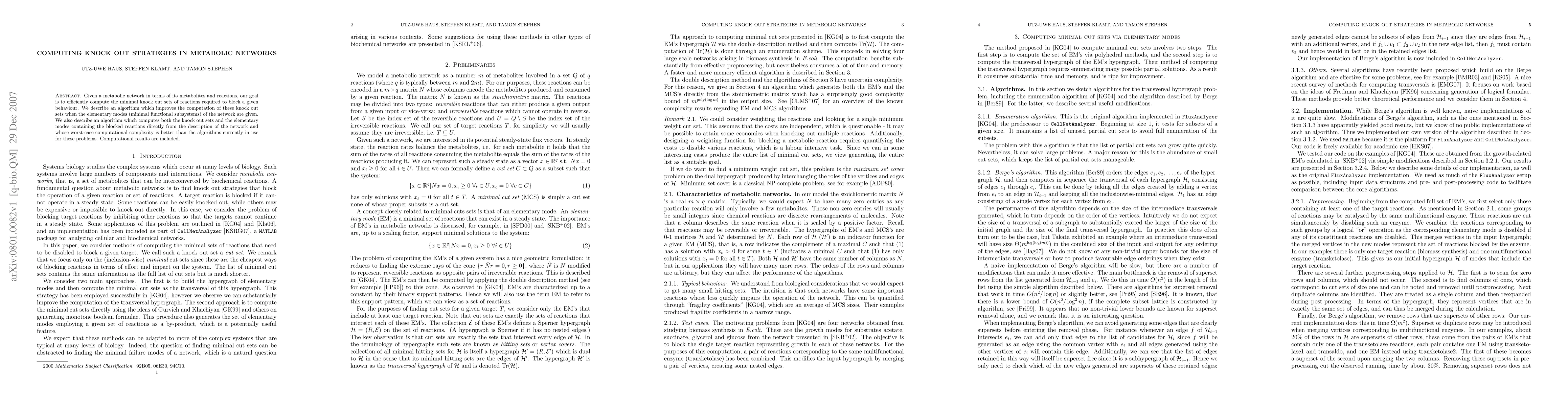 This paper presents algorithms to efficiently compute minimal knock out sets of reactions in metabolic networks to block specific behaviors, improving upon existing methods. It also introduces a new algorithm that directly computes both the knock out sets and the elementary modes, achieving better worst-case computational complexity.