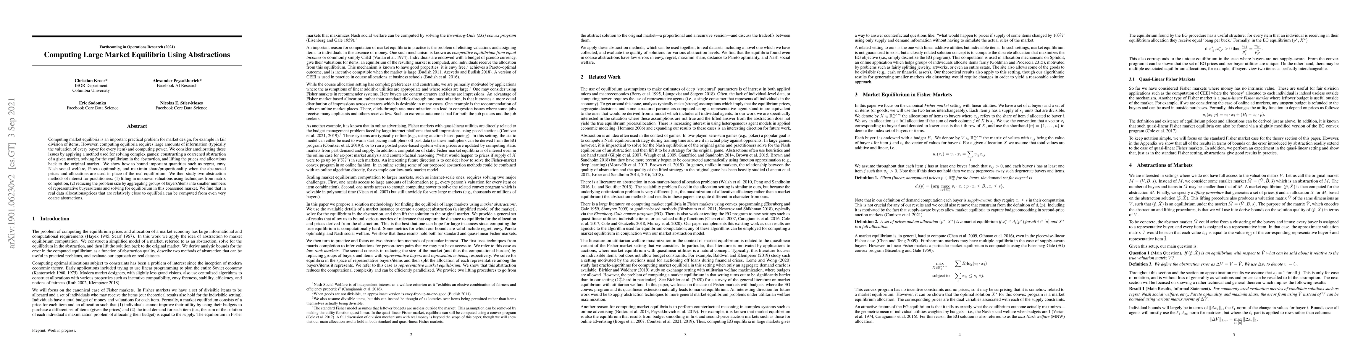 This paper proposes using abstractions to compute large market equilibria efficiently, addressing the high computational demands by constructing coarsened market models. It demonstrates methods for filling in unknown valuations and aggregating groups, showing that these approximations can yield allocations close to true equilibria while bounding regret, envy, and other important metrics.