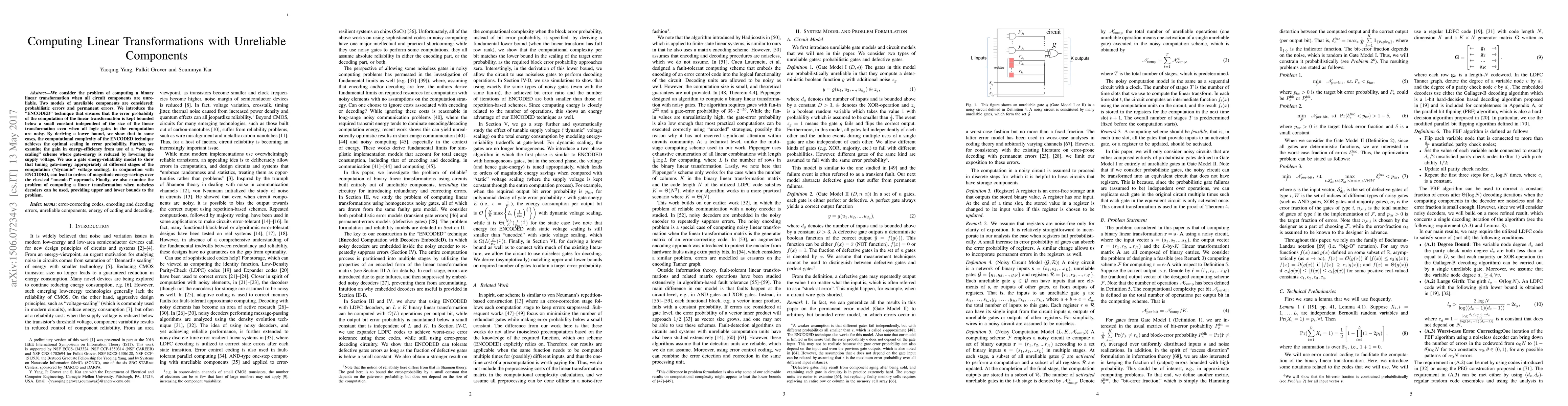 We consider the problem of computing a binary linear transformation using unreliable components when all circuit components are unreliable. Two noise models of unreliable components are considered: probabilistic errors and permanent errors. We introduce the "ENCODED" technique that ensures that the error probability of the computation of the linear transformation is kept bounded below a small constant independent of the size of the linear transformation even when all logic gates in the computation are noisy. Further, we show that the scheme requires fewer operations (in order sense) than its "uncoded" counterpart. By deriving a lower bound, we show that in some cases, the scheme is order-optimal. Using these results, we examine the gain in energy-efficiency from use of "voltage-scaling" scheme where gate-energy is reduced by lowering the supply voltage. We use a gate energy-reliability model to show that tuning gate-energy appropriately at different stages of the computation ("dynamic" voltage scaling), in conjunction with ENCODED, can lead to order-sense energy-savings over the classical "uncoded" approach. Finally, we also examine the problem of computing a linear transformation when noiseless decoders can be used, providing upper and lower bounds to the problem.