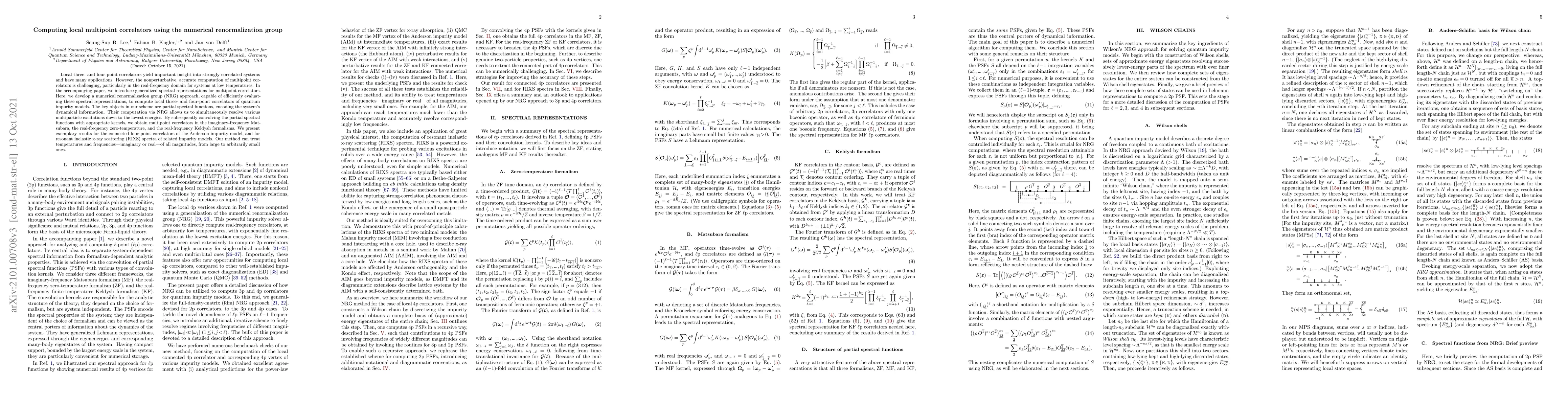 This paper introduces a numerical renormalization group (NRG) approach to compute local three- and four-point correlators for quantum impurity models, providing insights into strongly correlated systems. The method leverages partial spectral functions to resolve multiparticle excitations and yields multipoint correlators in various formalisms, demonstrating its effectiveness through examples like the Anderson impurity model and RIXS spectra.