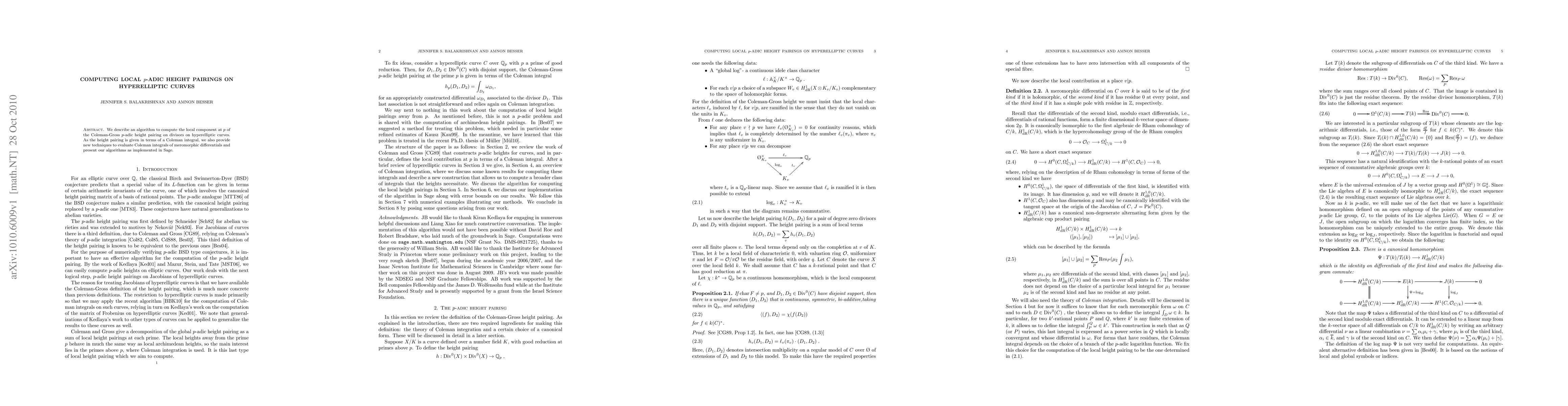 This paper presents an algorithm for computing the local p-adic height pairing on hyperelliptic curves, utilizing Coleman integrals. It introduces new techniques for evaluating these integrals and demonstrates the implementation in Sage.
