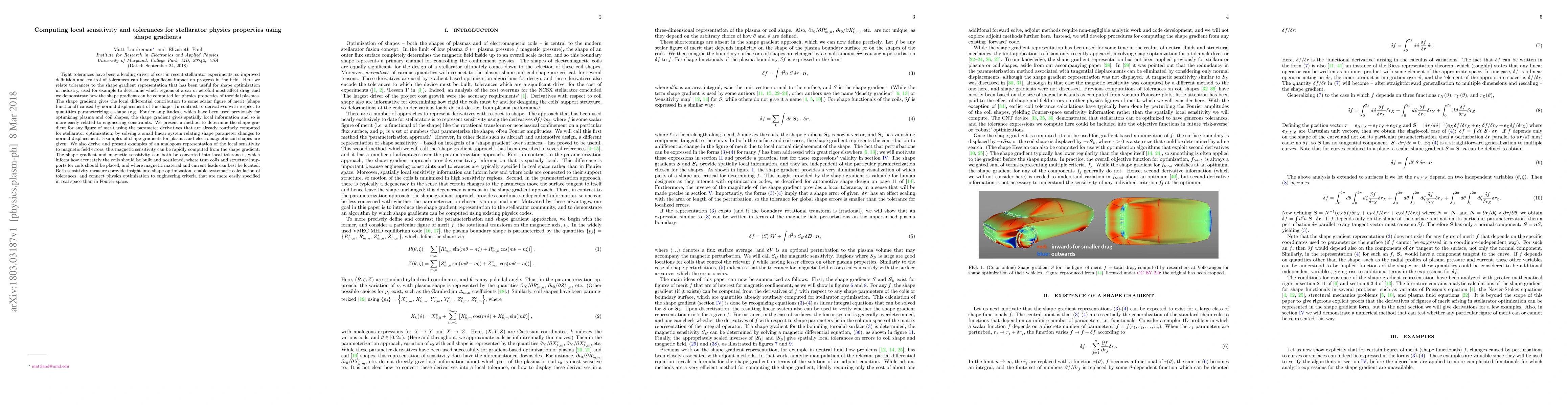This paper introduces the shape gradient method to compute local sensitivity and tolerances for stellarator physics properties, providing spatially local information that relates to engineering constraints. The shape gradient, derived from parameter derivatives, facilitates the determination of optimal coil and plasma shapes, and enables systematic calculation of tolerances based on magnetic sensitivity.