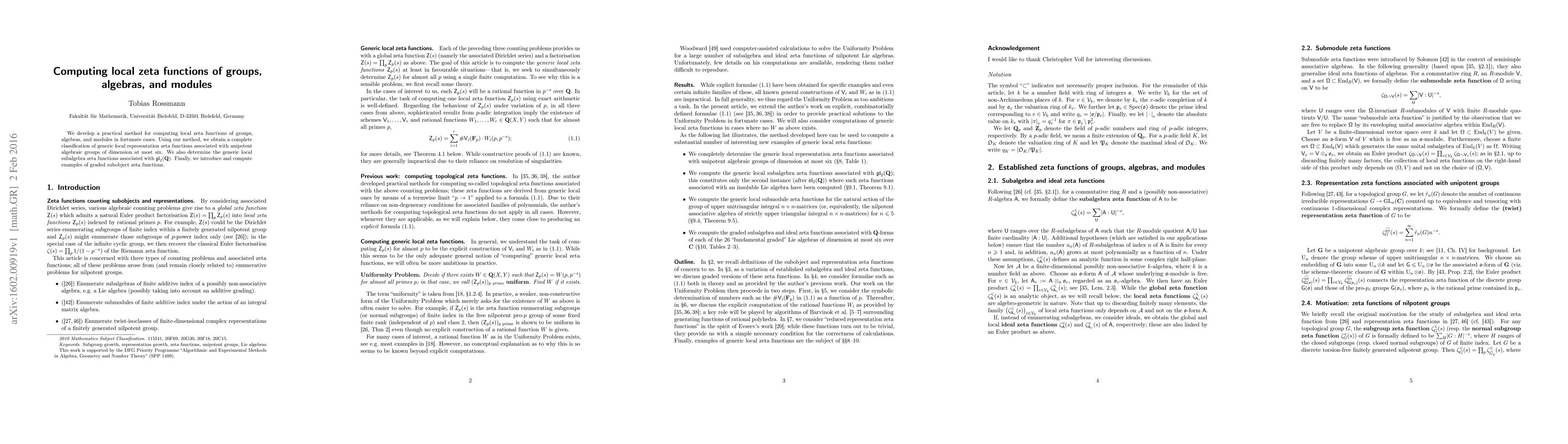 This paper presents a method for computing local zeta functions for groups, algebras, and modules, achieving a classification of these functions for unipotent algebraic groups up to dimension six and for $\mathfrak{gl}_2(\mathbf{Q})$, and introducing graded subobject zeta functions with examples.