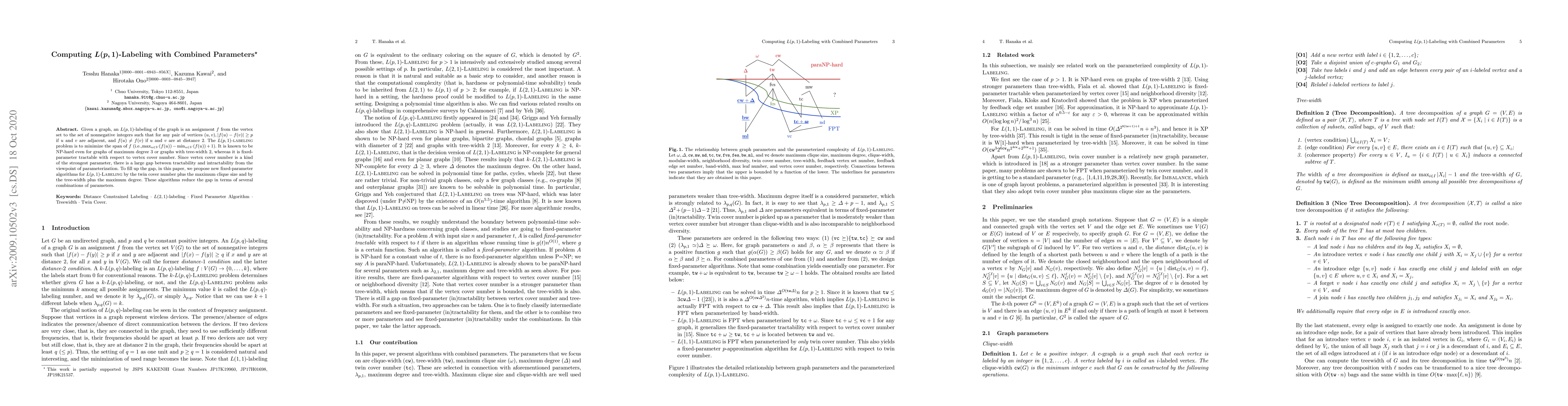 The paper introduces novel fixed-parameter algorithms for L(p,1)-labeling parameterized by twin cover number + maximum clique size and tree-width + maximum degree, enhancing our understanding of the problem's complexity.