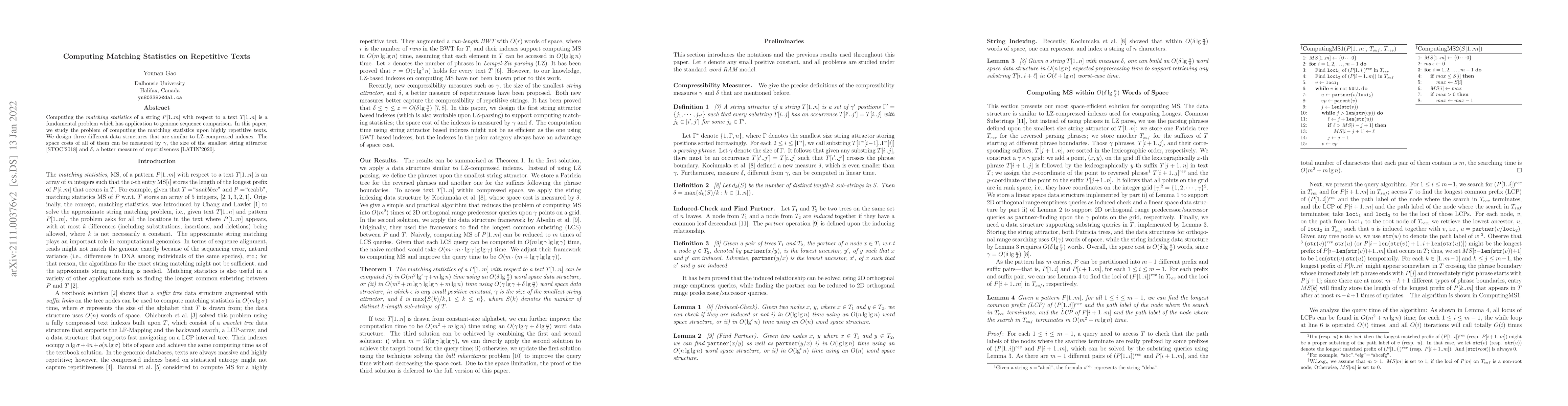 This paper addresses the challenge of computing matching statistics for repetitive texts, crucial for genome sequence comparison. It introduces three data structures akin to LZ-compressed indexes, with space efficiency tied to $\gamma$ and $\delta$, measures of string attractor size and repetitiveness.